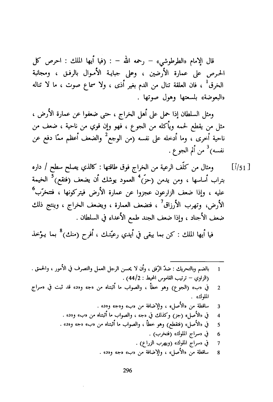 قال الإمام "الطرطوشي"- رحمه الله-: (فيا أيها الملك: احرص كل الحرص على عمارة الأرضين، وعلى جباية الأموال بالرفق، ومجانبة الخرق 1، فان العلقة تنال من الدم بغير أذى، ولا سماع صوت، ما لا تناله "البعوضة" بلسعتها وهول صوتها.