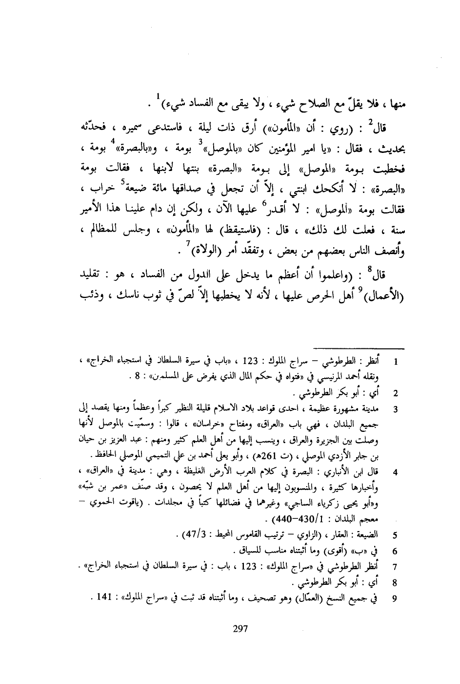 1 - أنظر: الطرطوشي- سراج الملوك: 123، "باب في سيرة السلطان في استجباء الخراج"، ونقله أحمد المرنيسي في "فتواه في حكم المال الذي يفرض على المسلمين": 8.