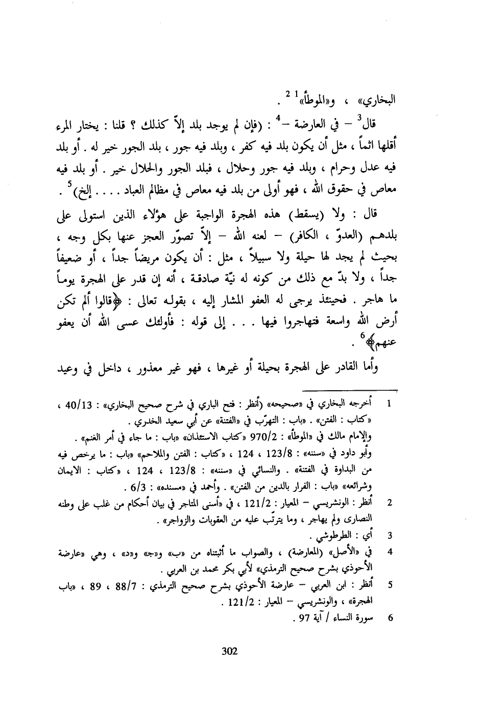 5 - أظر: ابن العربي- عارضة الأحوذى بشرح صحيح الترمذي: 7/ 88، 89، "باب الهجرة"، والونشريسي- المعيار: 2/ 121.