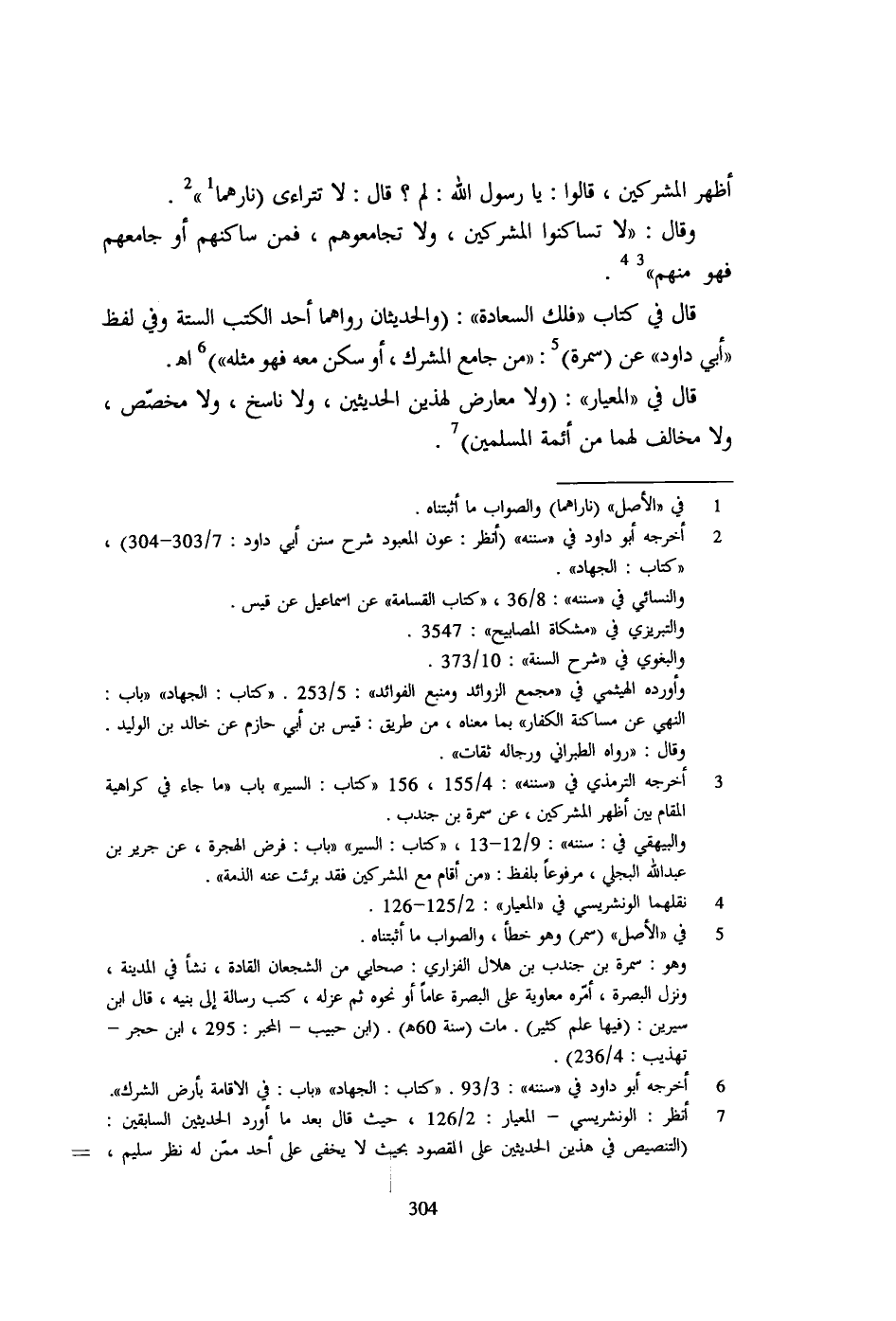 قال في كتاب "فلك السعادة": (والحديثان رواهما أحد الكتب الستة وفي لفظ "أبي داود" عن (سمرة) 5: "من جامع المشرك، أو سكن معه فهو مثله") 6 اهـ.