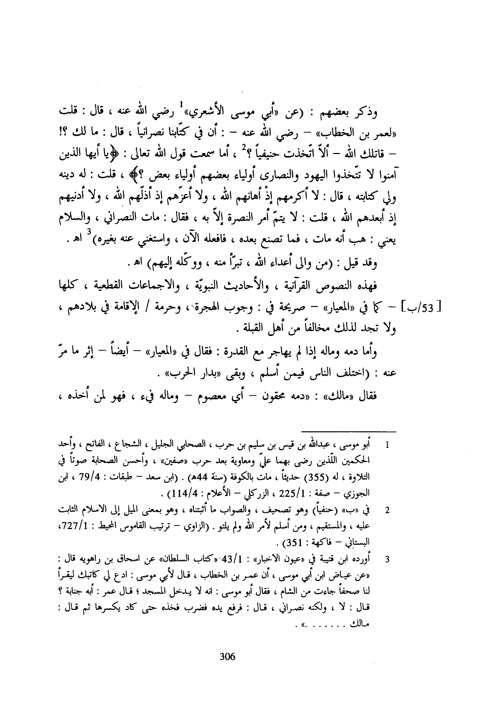 أورده ابن قتيبة في "عيون الاخبار": 43/ 1! "كتاب السلطان،) عن اسحاق بن راهويه قال: لأعن عياض ابن أممط موسى، أن عمر بن الخطاب، قال لأممط موسى: ادع لمط كاتبدً ليقرأ لنا صحفأ جاءت من الشام، فقال أبو موصى: انه لا يدخل المسجد؟ قال عمر: أبه جنابة؟ قال: لا، ولكنه نصراق، فال: فرفع يده فضرب فخذه حتى كاد يكسرها ثم قال: مالك ....... "."