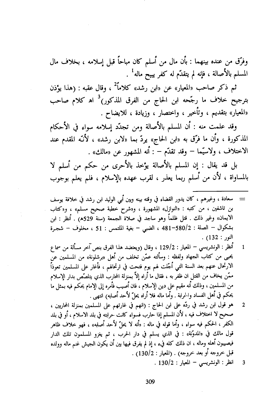 ثم ذكر صاحب "المعيار" عن "ابن رشد" كلاماً 2، وقال عقبه: (هذا يؤذن بترجيح خلاف ما رجّحه ابن الحاج من الفرق المذكور) 3 اهـ كلام صاحب "المعيار" بتقديم، وتأخير، واختصار، وزيادة، للايضاح.