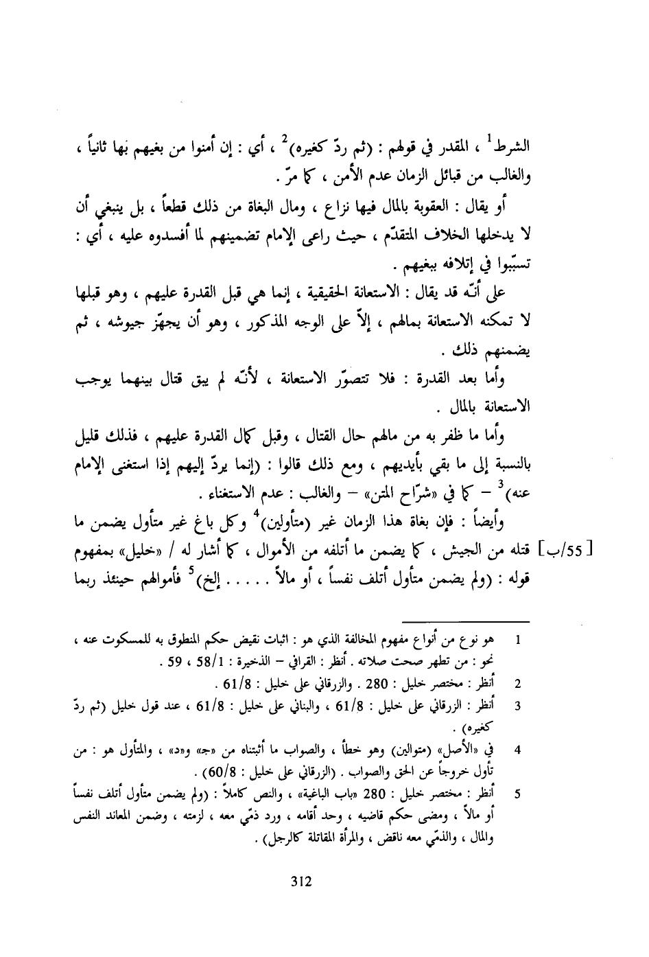 5 - أنظر: مختصر خليل: 280 "باب الباغية"، والنص كاملاً: (ولم يضمن متأول أتلف نفساً أو مالاً، ومضى حكم قاضيه، وحد أقامه، ورد ذمّي معه، لزمته، وضمن المعاند النفس والمال، والذمّي محه ناقض، والمرأة المقاتلة كالرجل).