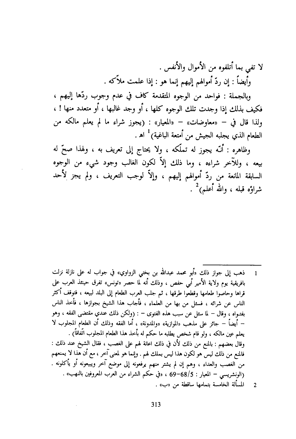 وبالجملة: فواحد من الوجوه المتقدمة كاف في عدم وجوب ردها إليهم، فكيف بذلك إذا وجدت تلك الوجوه كلها، أو وجد غالبها، أو متعدد منها!، ولذا قال في- "معاوضات" - "المعيار": (يجوز شراء ما لم يعلم مالكه من الطعام الذي يجلبه الجيش من أمتعة الباغية) 1 اهـ.