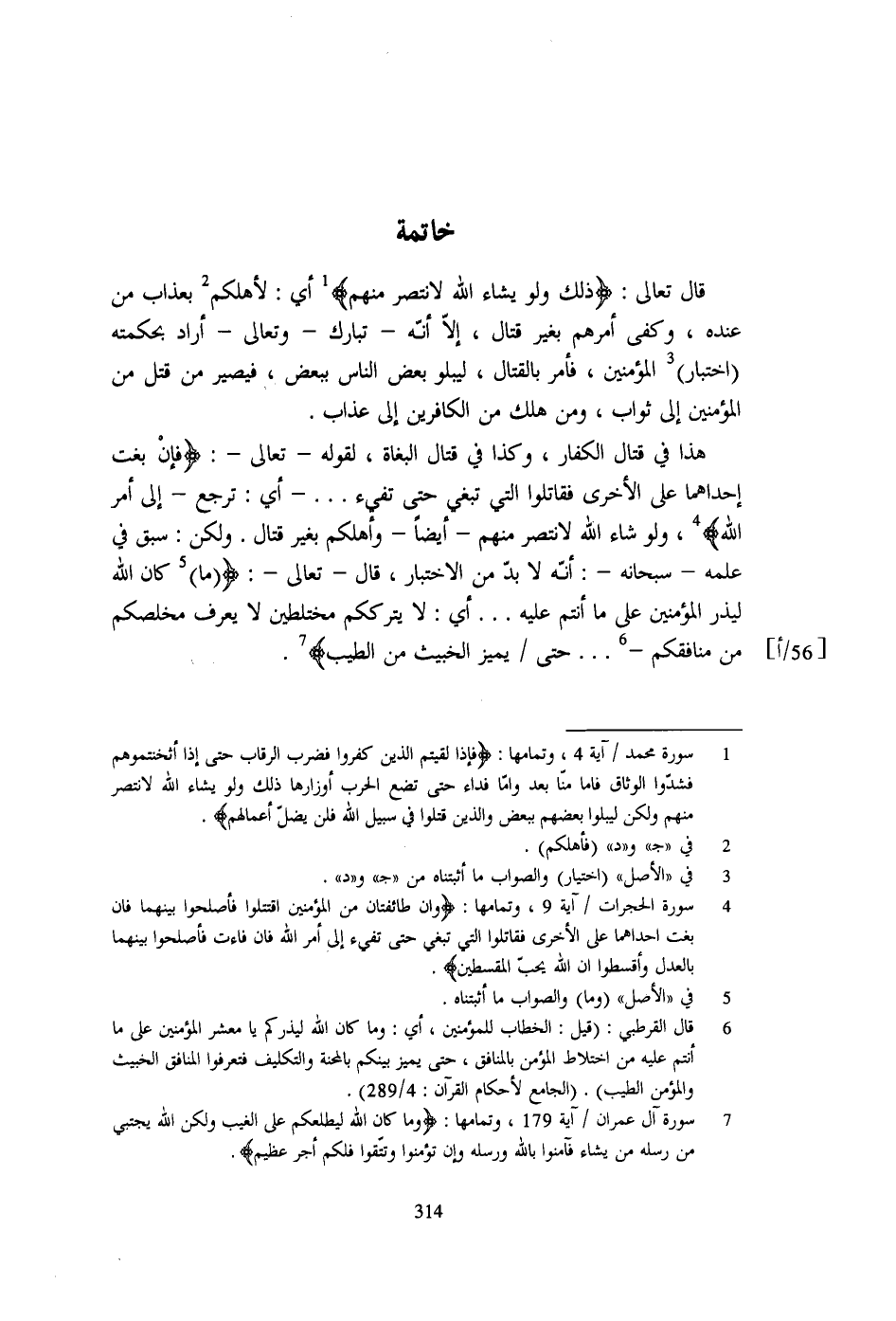 هذا في قتال الكفار، وكذا في قتال البغاة، لقوله- تعالى-: {فَإِنْ بَغَتْ إِحْدَاهُمَا عَلَى الْأُخْرَى فَقَاتِلُوا الَّتِي تَبْغِي حَتَّى تَفِيءَ ... - أي: ترجع- إِلَى أَمْرِ اللَّهِ} 4، ولو شاء الله لانتصر منهم- أيضاً- وأهلكم بغير قتال. ولكن: سبق في علمه- سبحانه-: أنّه لا بدّ من الاختبار، قال- تعالى-: {(مَا) 5 كَانَ اللَّهُ لِيَذَرَ الْمُؤْمِنِينَ عَلَى مَا أَنْتُمْ عَلَيْهِ ... أي: لا يترككم مختلطين لا يعرف مخلصكم من منافقكم-6 ... حَتَّى [56/أ] يَمِيزَ الْخَبِيثَ مِنَ الطَّيِّبِ} 7.
