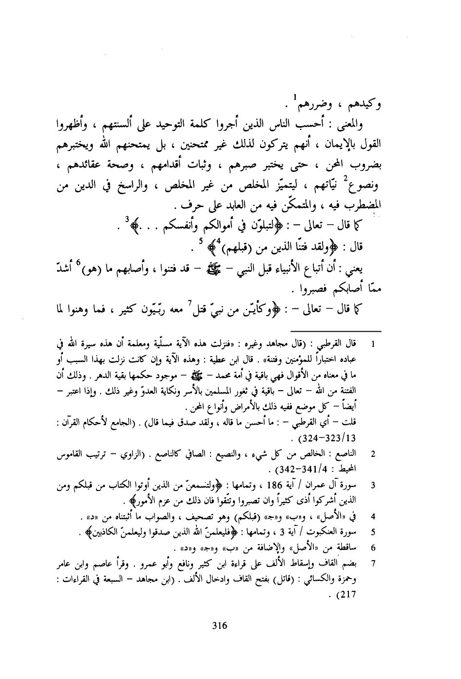 1 - قال القرطبي: (قال مجاهد وغيره: "فنزلت هذه الآية مسلّية ومعلمة أن هذه سيرة الله في عباده اختبارا للمؤمنين وفتنة". قال ابن عطية: وهذه الآية وإن كانت نزلت بهذا السبب أو ما في معناه من الأقوال فهي باقية في أمة محمد - صلى الله عليه وسلم - موجود حكمها بقية الدهر. وذلك أن الفتنة من الله- تعالى- باقية في ثغور المسلمين بالأسر ونكاية العدوّ وغير ذلك. وإذا اعتبر- أيضاً- كل موضع ففيه ذلك بالأمراض وأنواع المحن.