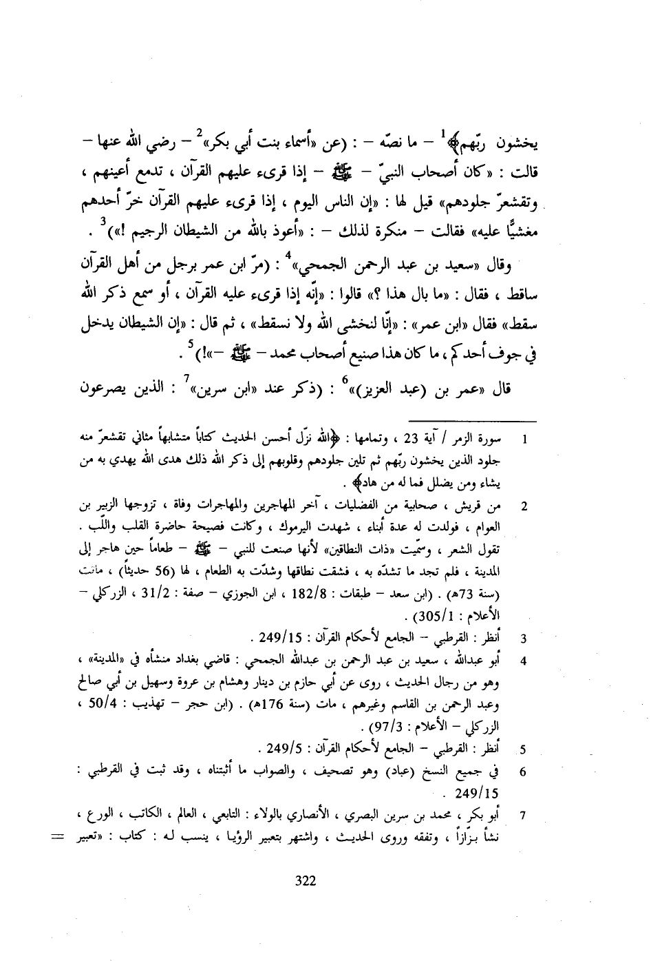 يَخْشَوْنَ رَبَّهُمْ} 1 - ما نصّه-: (عن "أساء بنت أبي بكر" 2 - رضي الله عنها- قالت: "كان أصحاب النبي - صلى الله عليه وسلم - إذا قرىء عليهم القرآن، تدمع أعينهم، وتقشعرّ جلودهم" قيل لها: "إن الناس اليوم، إذا قرىء عليهم القرآن خر أحدهم مغشيًّا عليه" فقالت- منكرة لذلك-: "أعوذ بالله من الشيطان الرجيم! ") 3.