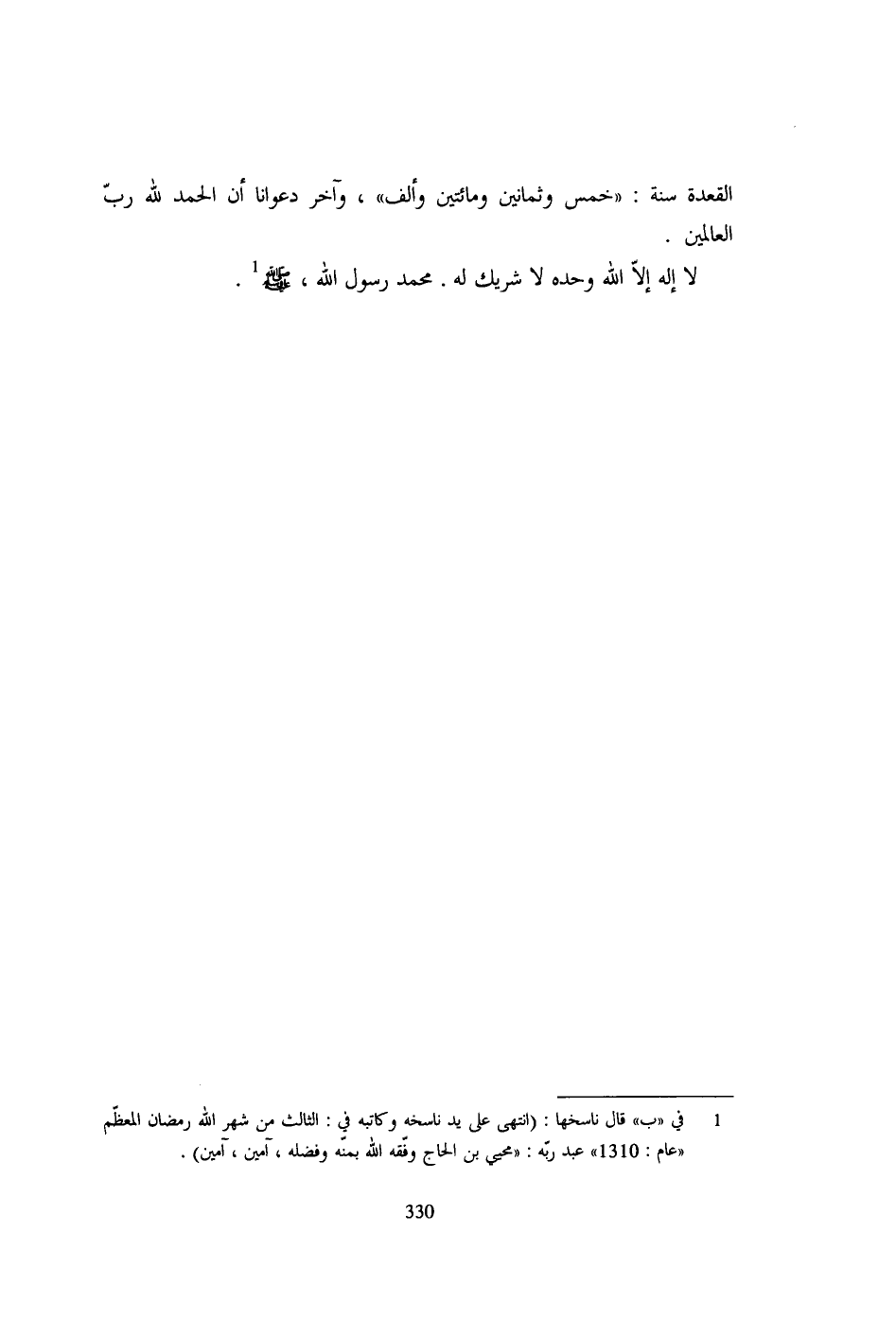 1 - في "ب" قال ناسخها: (انتهى على يد ناسخه وكاتبه في: الثالث من شهر الله رمضان المعظّم "عام: 1310" عبد ربّه: "محيي بن الحاج وفقه الله بمنّه وفضله، آمين، آمين).