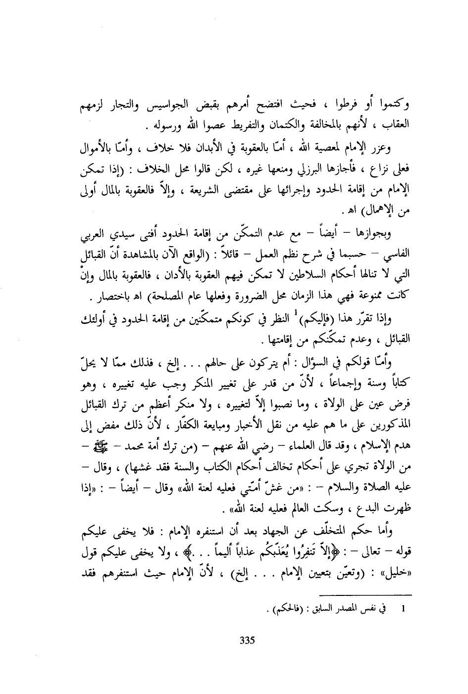 وأمّا قولكم في السؤال: أم يتركون على حالهم ... إلخ، فذلك ممّا لا يحلّ كتاباً وسنة وإجماعاً، لأنّ من قدر على تغيير المنكر وجب عليه تغييره، وهو فرض عين على الولاة، وما نصبوا إلاّ لتغييره، ولا منكر أعظم من ترك القبائل المذكورين على ما هم عليه من نقل الأخبار ومبايعة الكفّار، لأن ذلك مفض إلى هدم الإسلام، وقد قال العلماء- رضي الله عنهم- (من ترك أمة محمد - صلى الله عليه وسلم - من الولاة تجري على أحكام تخالف أحكام الكتاب والسنة فقد غشها)، وقال- عليه الصلاة والسلام-: "من غشّ أمّتي فعليه لعنة الله" وقال- أيضاً-: "إذا ظهرت البدع، وسكت العالم فعليه لعنة الله".