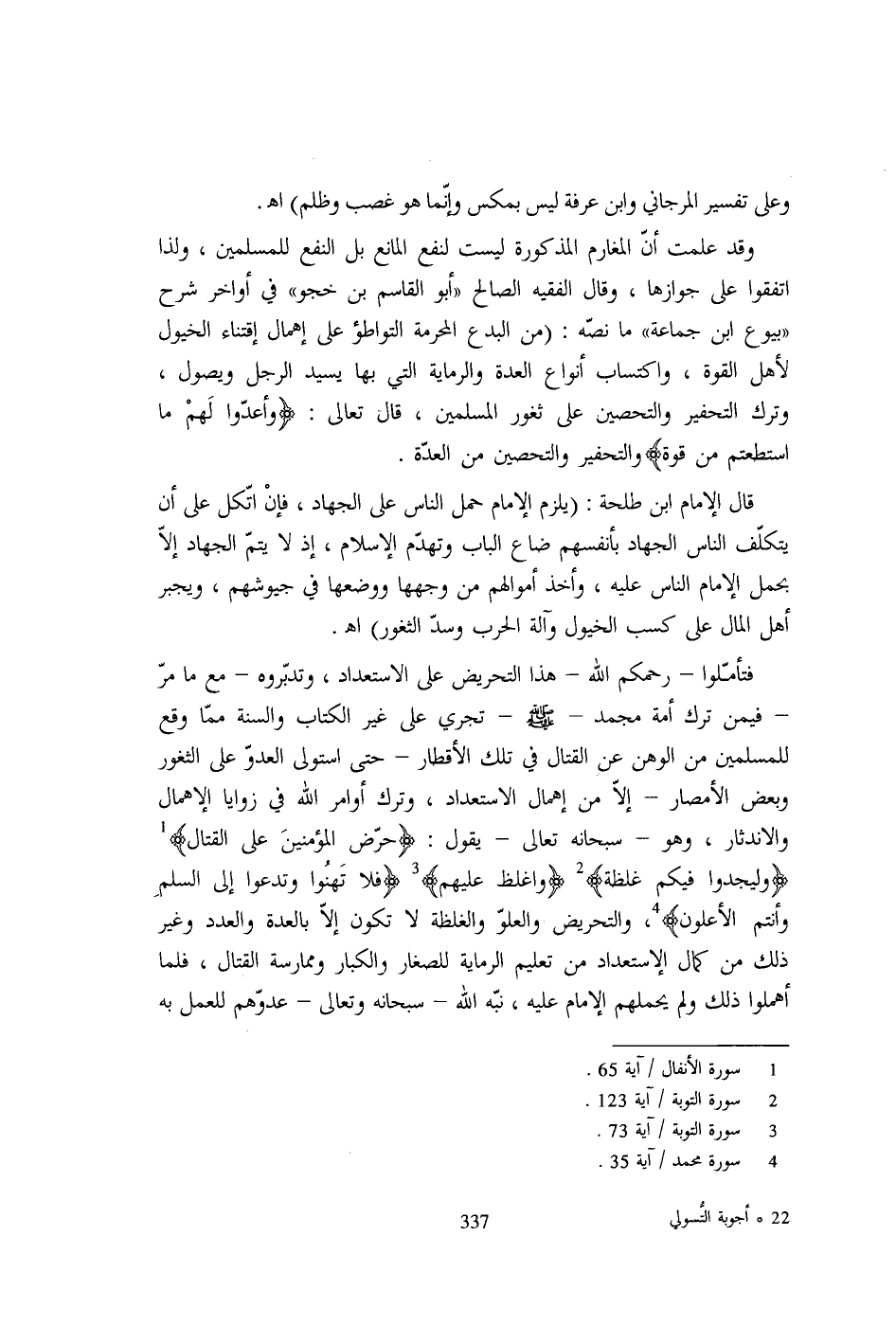 فتأمّلوا- رحمكم الله- هذا التحريض على الاستعداد، وتدبّروه- مع ما مرّ - فيمن ترك أمة محمد - صلى الله عليه وسلم - تجري على غير الكتاب والسنة ممّا وقع للمسلمين من الوهن عن القتال في تلك الأقطار- حتى استولى العدوّ على الثغور وبعض الأمصار- إلاّ من إهمال الاستعداد، وترك أوامر الله في زوايا الإهمال والاندثار، وهو- سبحانه تعالى- يقول: {حَرِّضِ الْمُؤْمِنِينَ عَلَى الْقِتَالِ} 1 {وَلْيَجِدُوا فِيكُمْ غِلْظَةً} 2 {وَاغْلُظْ عَلَيْهِمْ} 3 {فَلَا تَهِنُوا وَتَدْعُوا إِلَى السَّلْمِ وَأَنْتُمُ الْأَعْلَوْنَ} 4، والتحريض والعلوّ والغلظة لا تكون إلاّ بالعدة والعدد وغير ذلك من كمال الاستعداد من تعليم الرماية للصغار والكبار وممارسة القتال، فلما أهملوا ذلك ولم يحملهم الإمام عليه، نبّه الله- سبحانه وتعالى- عدوّهم للعمل به