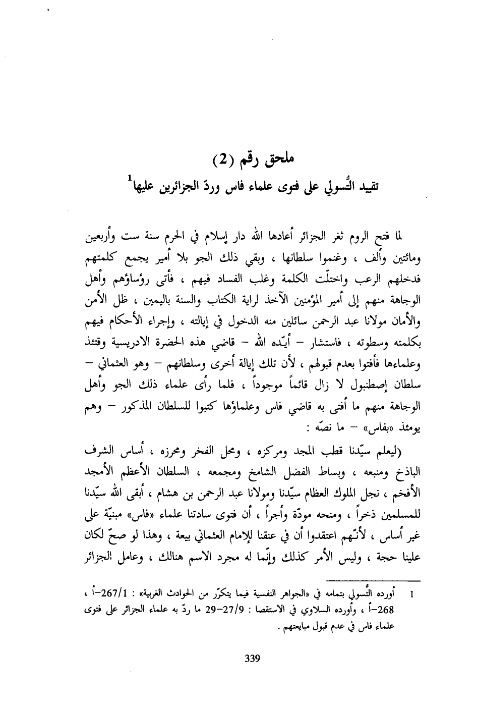 1 - أورده التُّسولي بتمامه في "الجواهر النفسية فيما يتكرر من الحوادث الغربية": 1/ 267 - أ، 268 - أ، وأورده السلاوي في الاستقصا: 9/ 27 - 29 ما ردّ به علماء الجزائر على فتوى علماء فاس في عدم قبول مبايعتهم.