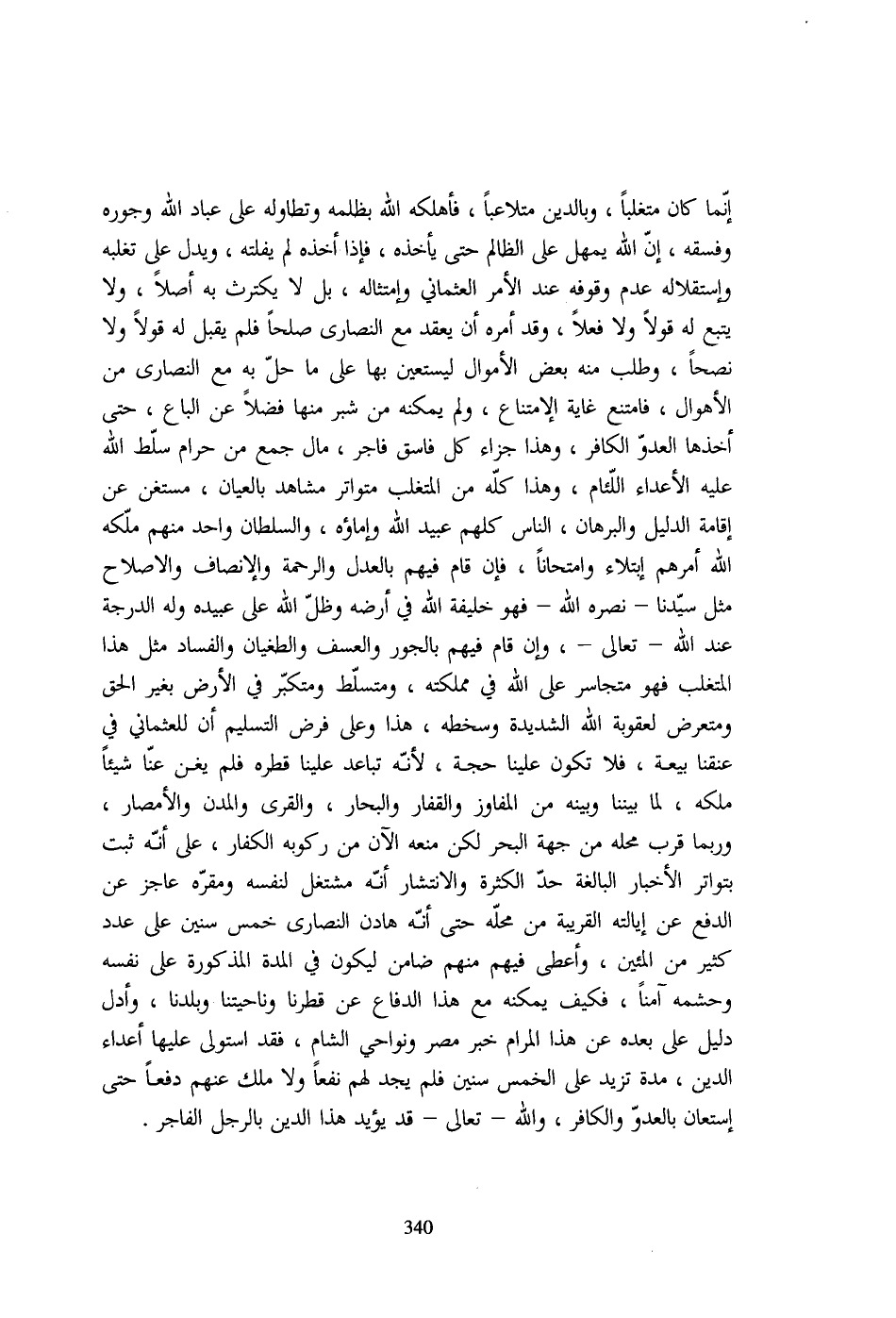 إنّما كان متغلباً، وبالدين متلاعباً، فأهلكه الله بظلمه وتطاوله على عباد الله وجوره وفسقه، إنّ الله يمهل على الظالم حتى يأخذه، فإذا أخذه لم يفلته، ويدل على تغلبه وإستقلاله عدم وقوفه عند الأمر العثماني وإمتثاله، بل لا يكترث به أصلاً، ولا يتبع له قولاً ولا فعلاً، وقد أمره أن يعقد مع النصارى صلحاً فلم يقبل له قولاً ولا نصحاً، وطلب منه بعض الأموال ليستعين بها على ما حلّ به مع النصارى من الأهوال، فامتنع غاية الامتناع، ولم يمكنه من شبر منها فضلاً عن الباع، حتى أخذها العدوّ الكافر، وهذا جزاء كل فاسق فاجر، مال جمع من حرام سلّط الله عليه الأعداء اللّئام، وهذا كلّه من المتغلب متواتر مشاهد بالعيان، مستغن عن إقامة الدليل والبرهان، الناس كلهم عبيد الله وإماؤه، والسلطان واحد منهم ملّكه الله أمرهم إبتلاء وامتحاناً، فإن قام فيهم بالعدل والرحمة والإنصاف والاصلاح مثل سيّدنا- نصره الله- فهو خليفة الله في أرضه وظلّ الله على عبيده وله الدرجة عند الله- تعالى-، وإن قام فيهم بالجور والعسف والطغيان والفساد مثل هذا المتغلب فهو متجاسر على الله في مملكته، ومتسلّط ومتكبّر في الأرض بغير الحق ومتعرض لعقوبة الله الشديدة وسخطه، هذا وعلى فرض التسليم أن للعثماني في عنقنا بيعة، فلا تكون علينا حجة، لأنّه تباعد علينا قطره فلم يغن عنّا شيئاً ملكه، لما بيننا وبينه من المفاوز والقفار والبحار، والقرى والمدن والأمصار، وربما قرب محله من جهة البحر لكن منعه الآن من ركوبه الكفار، على أنّه ثبت بتواتر الأخبار البالغة حدّ الكثرة والانتشار أنّه مشتغل لنفسه ومقرّه عاجز عن الدفع عن إيالته القريبة من محلّه حتى أنّه هادن النصارى خمس سنين على عدد كثير من المئين، وأعطى فيهم منهم ضامن ليكون في المدة المذكورة على نفسه وحشمه آمناً، فكيف يمكنه مع هذا الدفاع عن قطرنا وناحيتنا وبلدنا، وأدل دليل على بعده عن هذا المرام خبر مصر ونواحي الشام، فقد استولى عليها أعداء الدين، مدة تزيد على الخمس سنين فلم يجد لهم نفعاً ولا ملك عنهم دفعاً حتى استعان بالعدوّ والكافر، والله- تعالى- قد يؤيد هذا الدين بالرجل الفاجر.