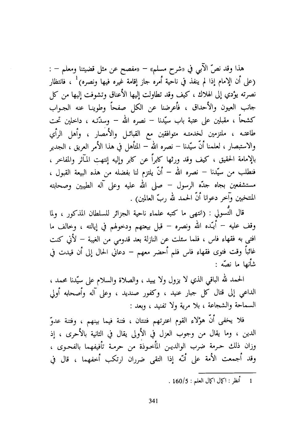 هذا وقد نصّ الآبي في "شرح مسلم" - "مفصح عن مثل قضيتنا ومعلم-: (على أن الإمام إذا لم ينفذ في ناحية أمره جاز إقامة غيره فيها ونصره) 1، فانتظار نصرته يؤدي إلى الهلاك، كيف وقد تطاولت إليها الأعناق وتشوفت إليها من كل جانب العيون والأحداق، فأعرضنا عن الكل صفحاً وطوينا عنه الجواب كشحاً، مقبلين على عتبة باب سيّدنا- نصره الله- وسدّته، داخلين تحت طاعته، ملتزمين لخدمته متوافقين مع القبائل والأمصار، وأهل الرأي والاستبصار، لعلمنا أنّ سيّدنا- نصره الله- المتأهل في هذا الأمر العريق، الجدير بالإمامة الحقيق، كيف وقد ورثها كابراً عن كابر وإليه إنتهت المآثر والمفاخر، فنطلب من سيّدنا- نصره الله- أنّ يلتزم لنا بفضله من هذه البيعة القبول، مستشفعين بجاه جدّه الرسول- صلى الله عليه وعلى آله الطيبين وصحابته المنتخبين وآخر دعوانا أنّ الحمد لله ربّ العالمين).