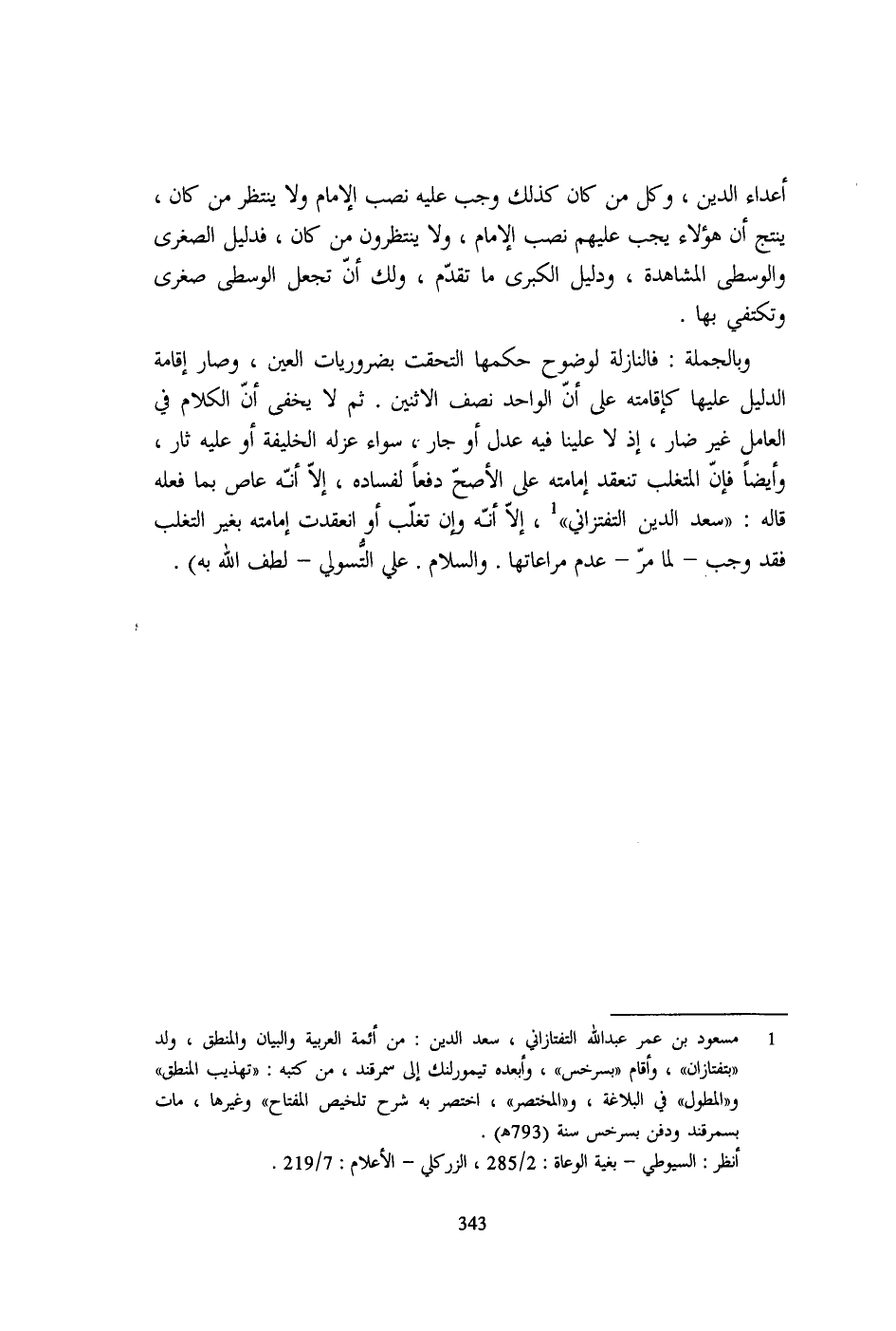 وبالجملة: فالنازلة لوضوح حكمها التحقت بضروريات العين، وصار إقامة الدليل عليها كإقامته على أنّ الواحد نصف الاثنين. ثم لا يخفى أنّ الكلام في العامل غير ضار، إذ لا علينا فيه عدل أو جار، سواء عزله الخليفة أو عليه ثار، وأيضاً فإنّ المتغلب تنعقد إمامته على الأصحّ دفعاً لفساده، إلاّ أنّه عاص بما فعله قاله: "سعد الدين التفتزاني" 1، إلاّ أنّه وإن تغلّب أو انعقدت إمامته بغير التغلب فقد وجب- لما مرّ- عدم مراعاتها. والسلام. علي التُّسولي- لطف الله به).