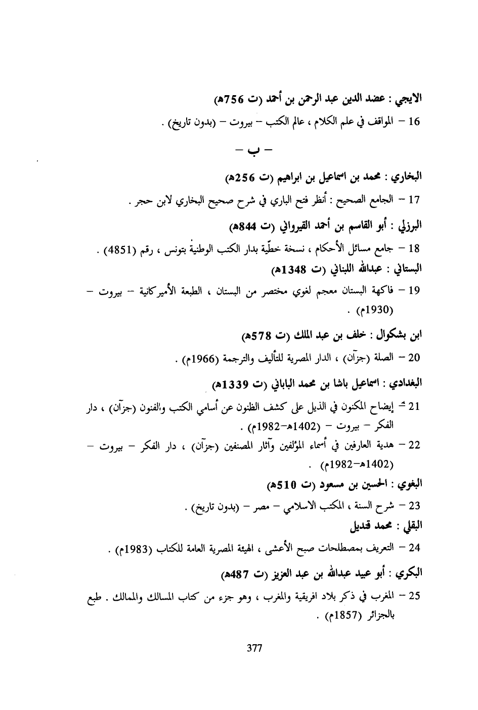 25 - المغرب في ذكر بلاد افريقية والمغرب، وهو جزء من كتاب المسالك والممالك. طبع بالجزائر (1857م).