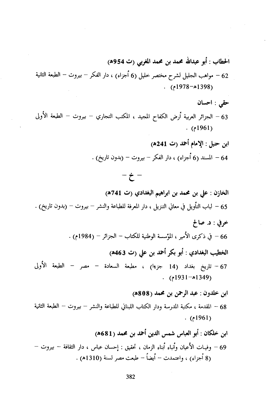 69 - وفيات الأعيان وأنباء أبناء الزمان، تحقيق: إحسان عباس، دار الثقافة- بيروت- (8 أجزاء)، واعتمدت- أيضاً- طبعت مصر لسنة (1310هـ).