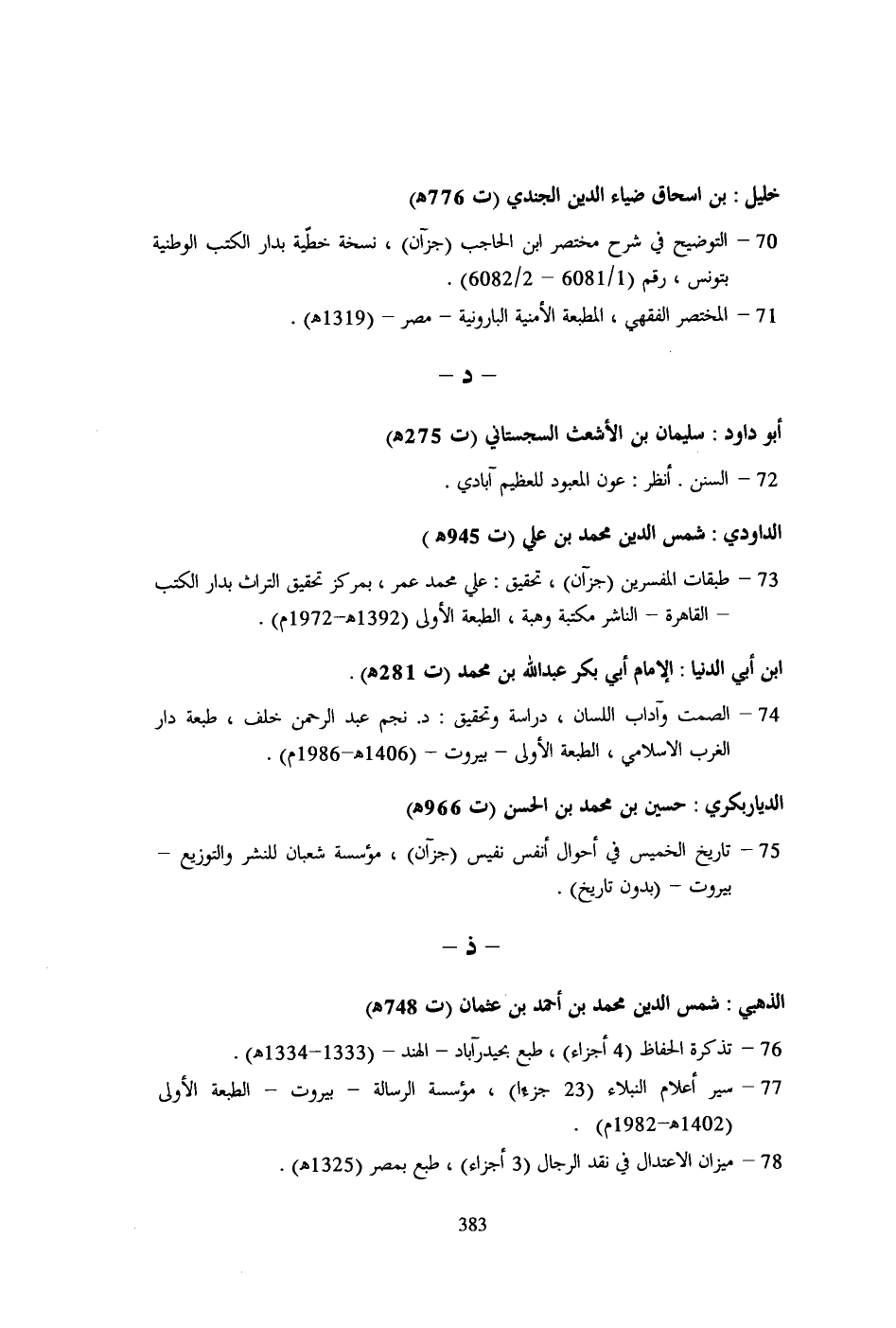 75 - تاريخ الخميس في أحوال أنفس نفيس (جزآن)، مؤسسة شعبان للنشر والتوزيع- بيروت- (بدون تاريخ).