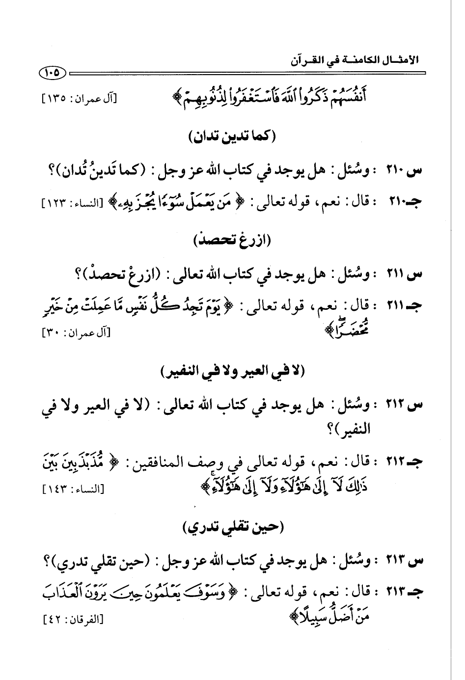 (س 213:) وسئل: هل يوجد في كتاب الله عز وجل: (حين تقلي تدري)؟