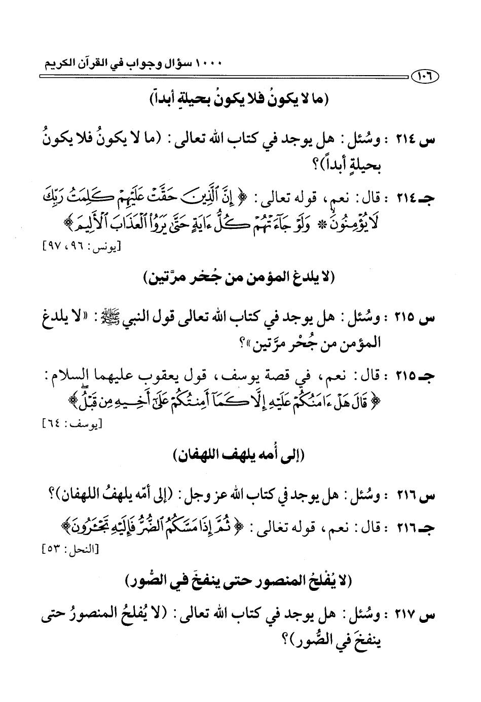 (س 215:) وسئل: هل يوجد في كتاب الله تعالى قول النبي صلّى الله عليه وسلّم: «لا يلدغ المؤمن من جحر مرّتين»؟