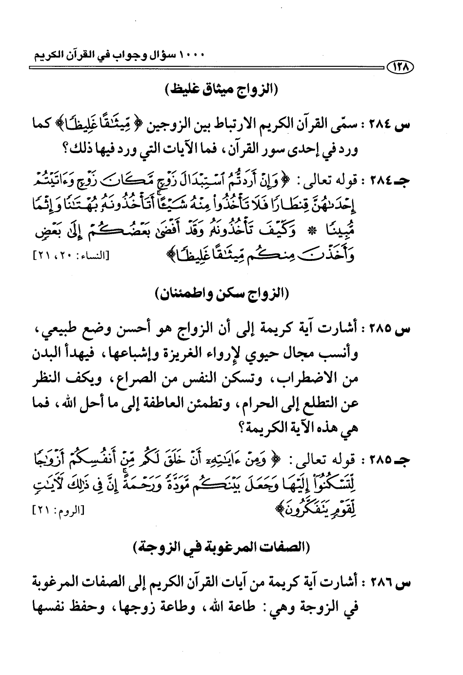 (س 286:) أشارت آية كريمة من آيات القرآن الكريم إلى الصفات المرغوبة في الزوجة وهي: طاعة الله، وطاعة زوجها، وحفظ نفسها