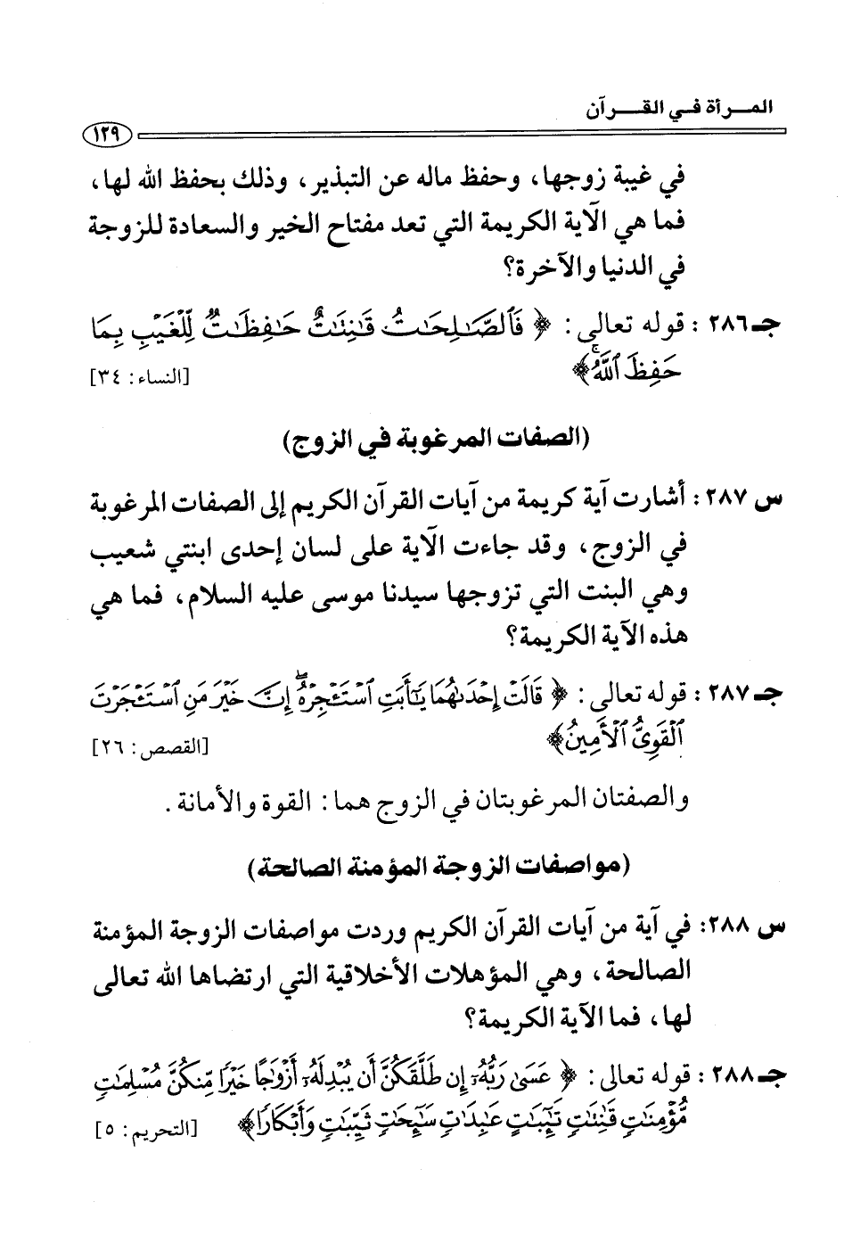 (س 288:) في آية من آيات القرآن الكريم وردت مواصفات الزوجة المؤمنة الصالحة، وهي المؤهلات الأخلاقية التي ارتضاها الله تعالى لها، فما الآية الكريمة؟