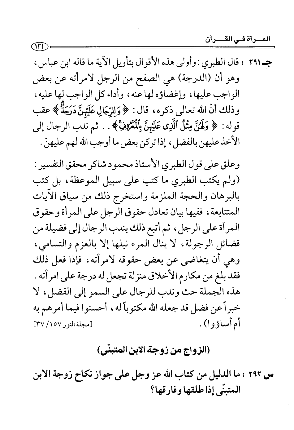 (ج 291:) قال الطبري: وأولى هذه الأقوال بتأويل الآية ما قاله ابن عباس، وهو أن (الدرجة) هي الصفح من الرجل لامرأته عن بعض الواجب عليها، وإغضاؤه لها عنه، وأداء كل الواجب لها عليه، وذلك أنّ الله تعالى ذكره، قال: وَلِلرِّجالِ عَلَيْهِنَّ دَرَجَةٌ عقب قوله: وَلَهُنَّ مِثْلُ الَّذِي عَلَيْهِنَّ بِالْمَعْرُوفِ ... ثم ندب الرجال إلى الأخذ عليهن بالفضل، إذا تركن بعض ما أوجب الله لهم عليهنّ.