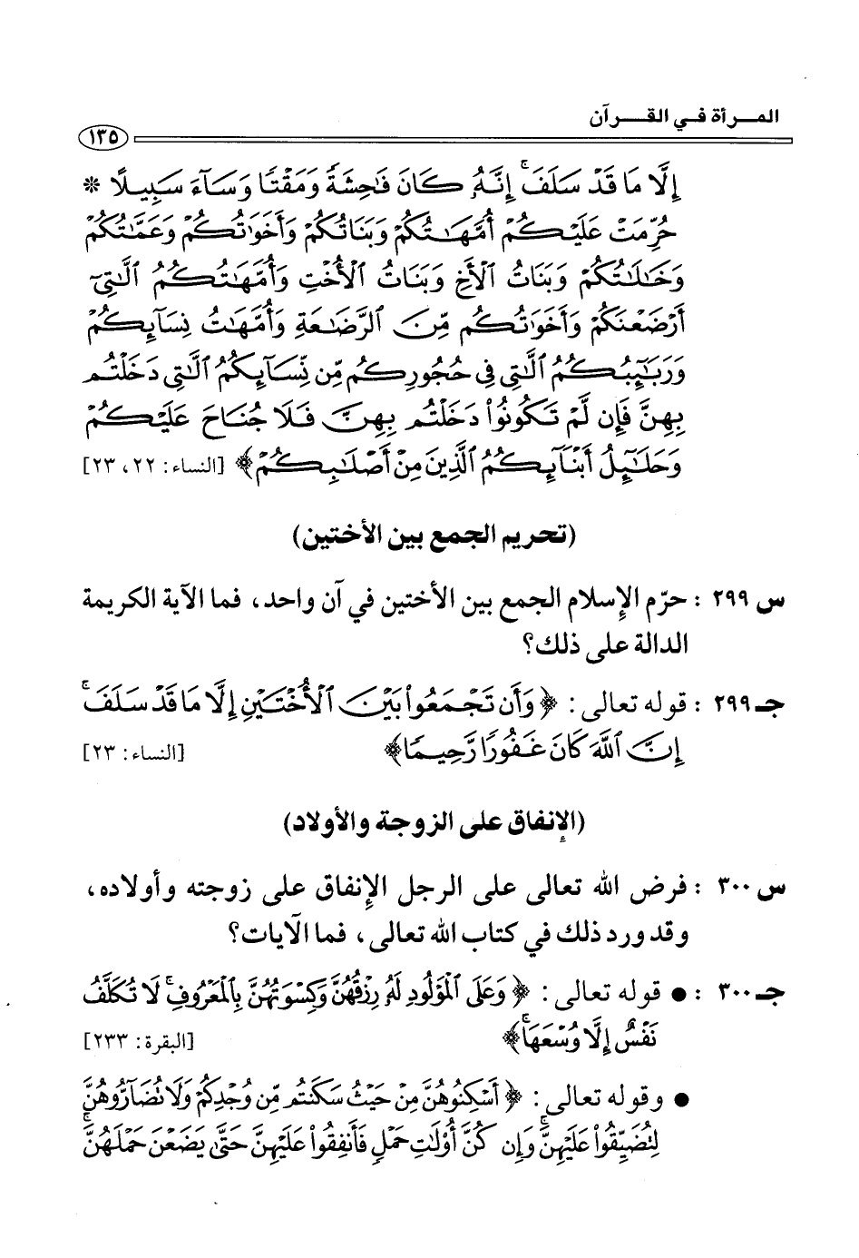 (س 299:) حرّم الإسلام الجمع بين الأختين في آن واحد، فما الآية الكريمة الدالة على ذلك؟
