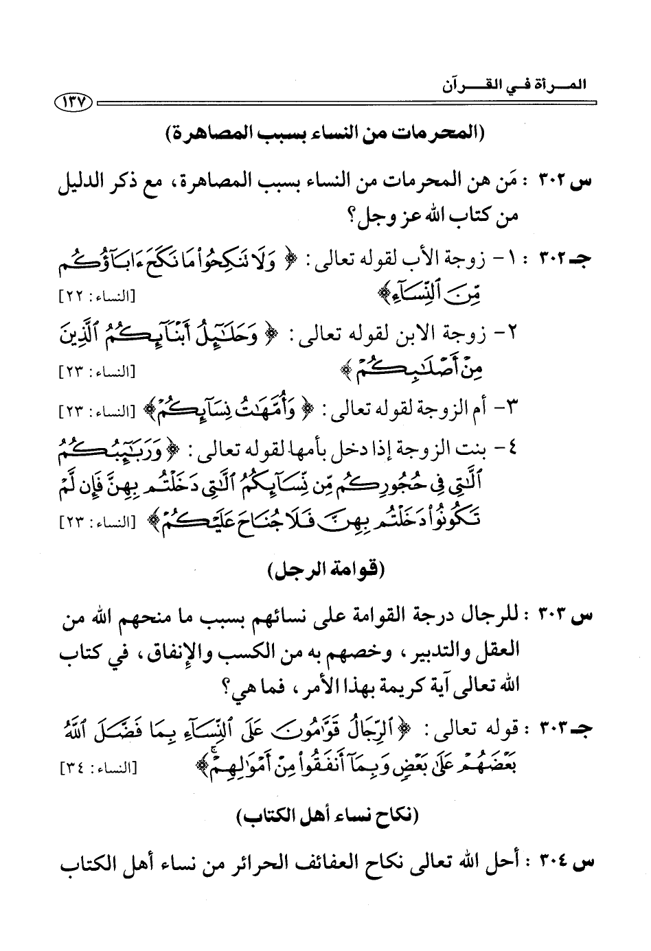 (ج 303:) قوله تعالى: الرِّجالُ قَوَّامُونَ عَلَى النِّساءِ بِما فَضَّلَ اللَّهُ بَعْضَهُمْ عَلى بَعْضٍ وَبِما أَنْفَقُوا مِنْ أَمْوالِهِمْ [النساء: 34]
