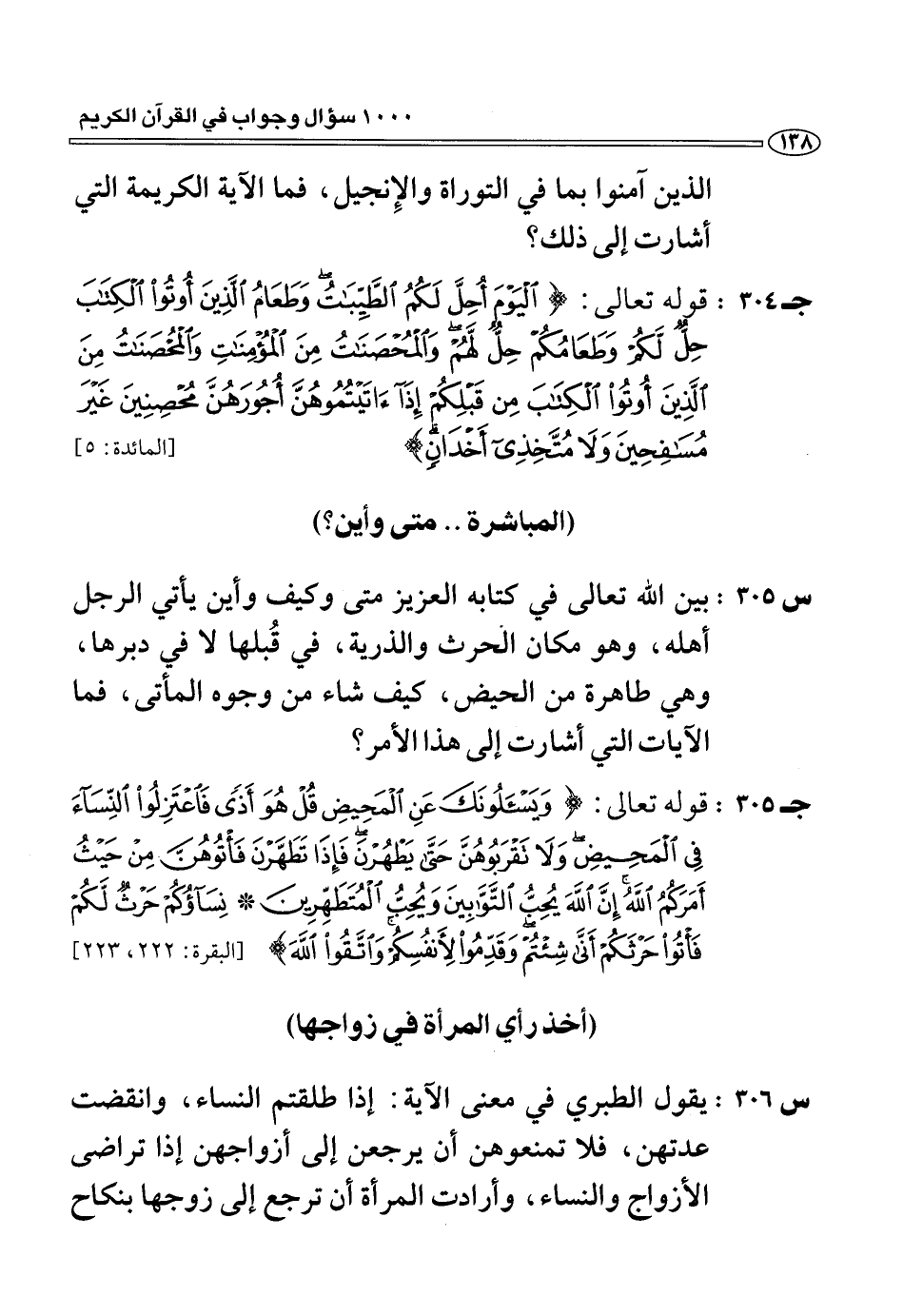 (س 305:) بين الله تعالى في كتابه العزيز متى وكيف وأين يأتي الرجل أهله، وهو مكان الحرث والذرية، في قبلها لا في دبرها، وهي طاهرة من الحيض، كيف شاء من وجوه المأتى، فما الآيات التي أشارت إلى هذا الأمر؟