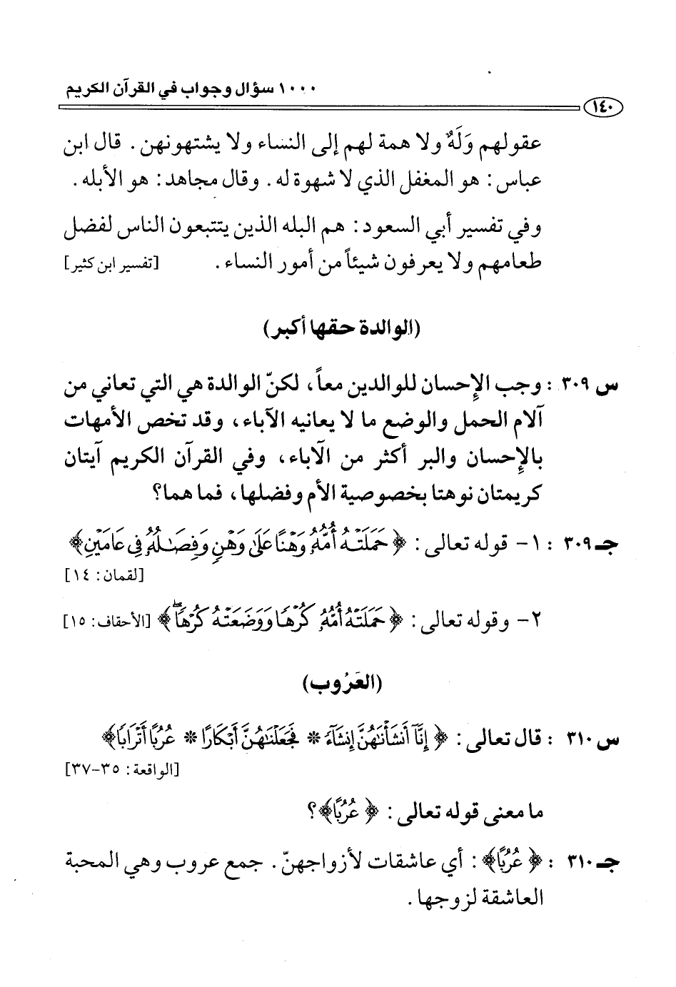(س 310:) قال تعالى: إِنَّا أَنْشَأْناهُنَّ إِنْشاءً* فَجَعَلْناهُنَّ أَبْكاراً* عُرُباً أَتْراباً [الواقعة: 35 - 37] ما معنى قوله تعالى: عُرُباً؟