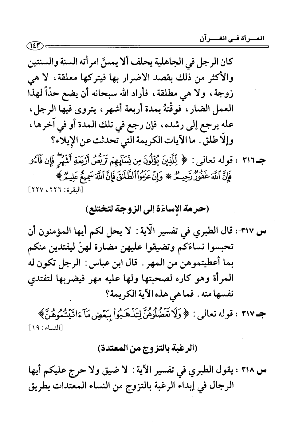 (س 317:) قال الطبري في تفسير الآية: لا يحل لكم أيها المؤمنون أن تحبسوا نساءكم وتضيقوا عليهن مضارة لهنّ ليفتدين منكم بما أعطيتموهن من المهر. قال ابن عباس: الرجل تكون له المرأة وهو كاره لصحبتها ولها عليه مهر فيضربها لتفتدي نفسها منه. فما هي هذه الآية الكريمة؟