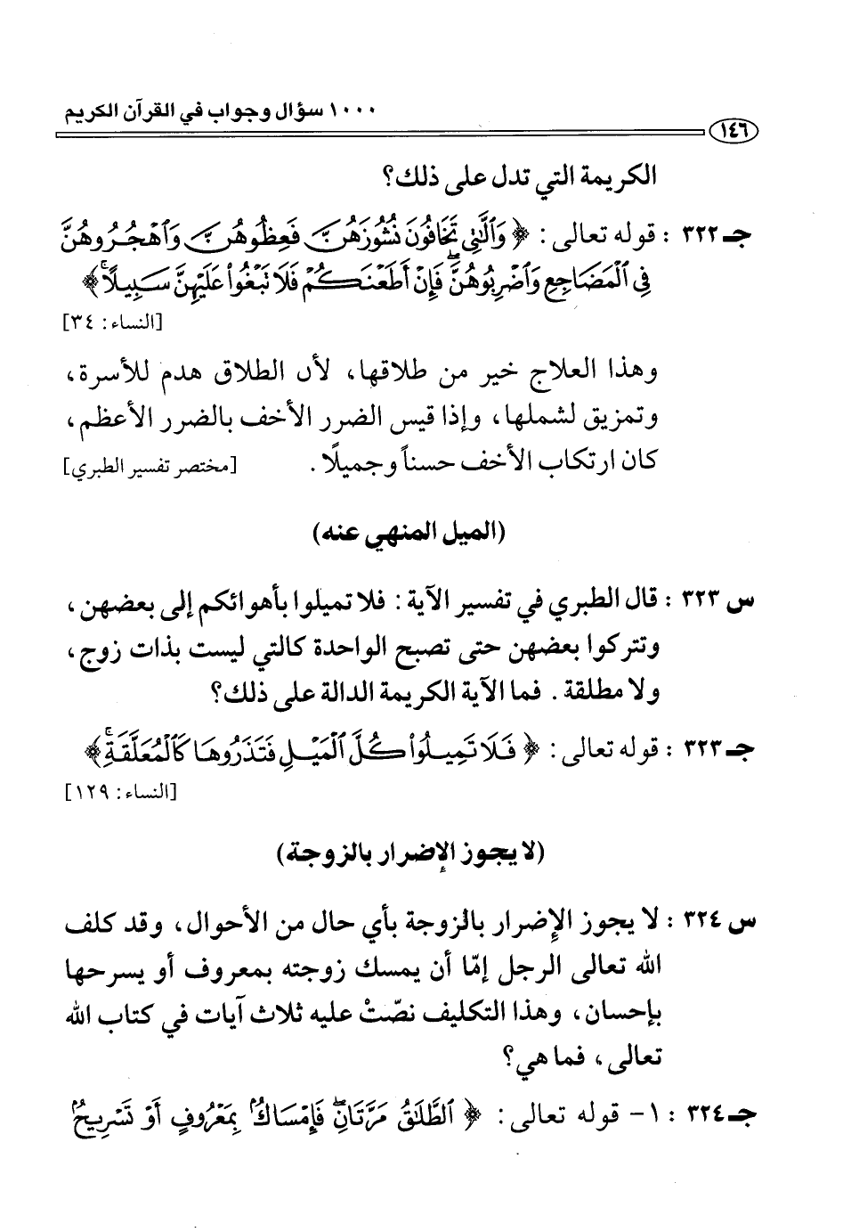 (س 323:) قال الطبري في تفسير الآية: فلا تميلوا بأهوائكم إلى بعضهن، وتتركوا بعضهن حتى تصبح الواحدة كالتي ليست بذات زوج، ولا مطلقة. فما الآية الكريمة الدالة على ذلك؟