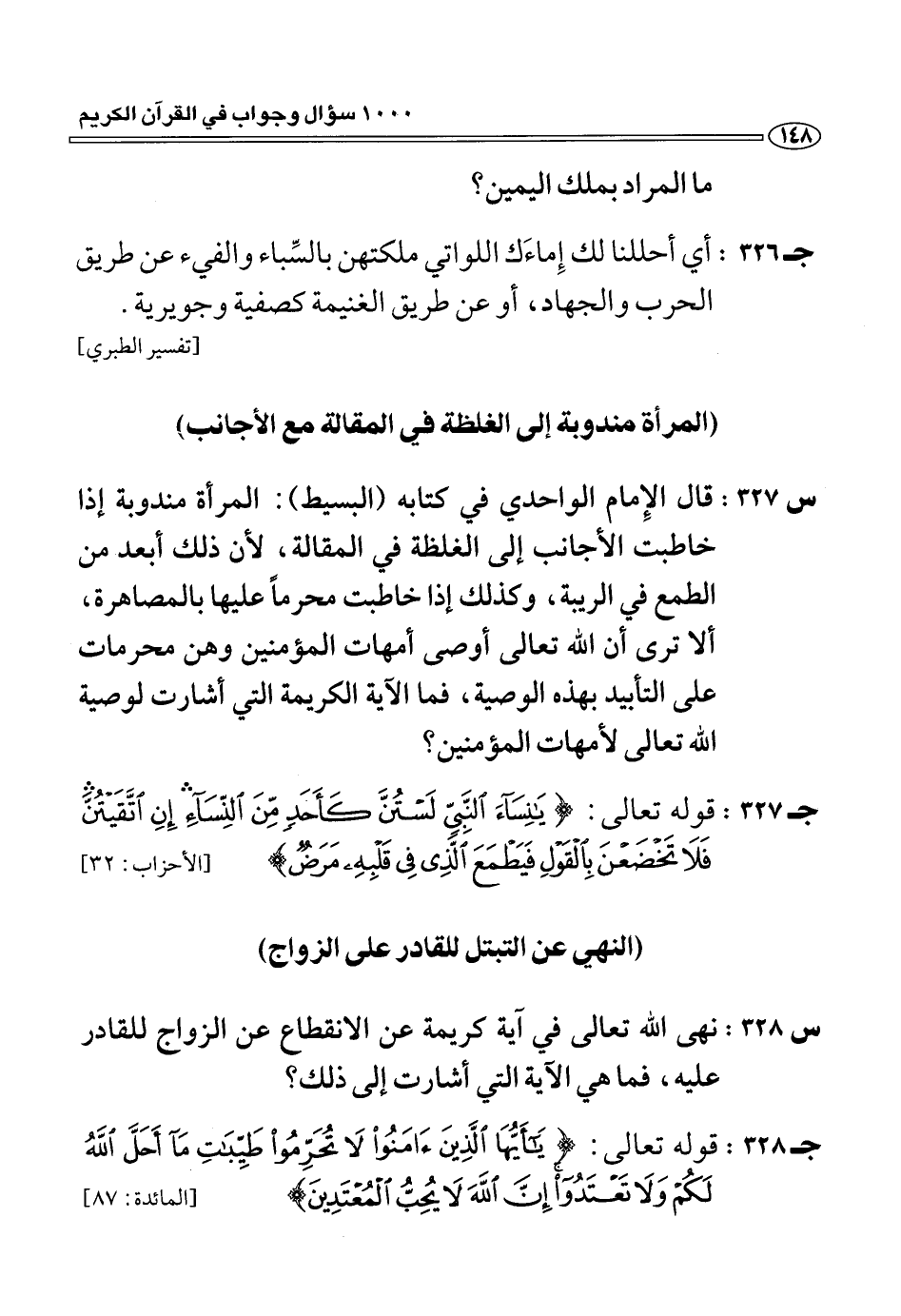 (س 327:) قال الإمام الواحدي في كتابه (البسيط): المرأة مندوبة إذا خاطبت الأجانب إلى الغلظة في المقالة، لأن ذلك أبعد من الطمع في الريبة، وكذلك إذا خاطبت محرما عليها بالمصاهرة، ألا ترى أن الله تعالى أوصى أمهات المؤمنين وهن محرمات على التأبيد بهذه الوصية، فما الآية الكريمة التي أشارت لوصية الله تعالى لأمهات المؤمنين؟