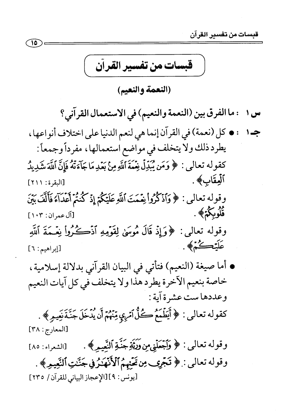 كقوله تعالى: وَمَنْ يُبَدِّلْ نِعْمَةَ اللَّهِ مِنْ بَعْدِ ما جاءَتْهُ فَإِنَّ اللَّهَ شَدِيدُ الْعِقابِ. [البقرة: 211] وقوله تعالى: وَاذْكُرُوا نِعْمَتَ اللَّهِ عَلَيْكُمْ إِذْ كُنْتُمْ أَعْداءً فَأَلَّفَ بَيْنَ قُلُوبِكُمْ. [آل عمران: 103] وقوله تعالى: وَإِذْ قالَ مُوسى لِقَوْمِهِ اذْكُرُوا نِعْمَةَ اللَّهِ عَلَيْكُمْ. [إبراهيم: 6] أما صيغة (النعيم) فتأتي في البيان القرآني بدلالة إسلامية، خاصة بنعيم الآخرة يطرد هذا ولا يتخلف في كل آيات النعيم وعددها ست عشرة آية: