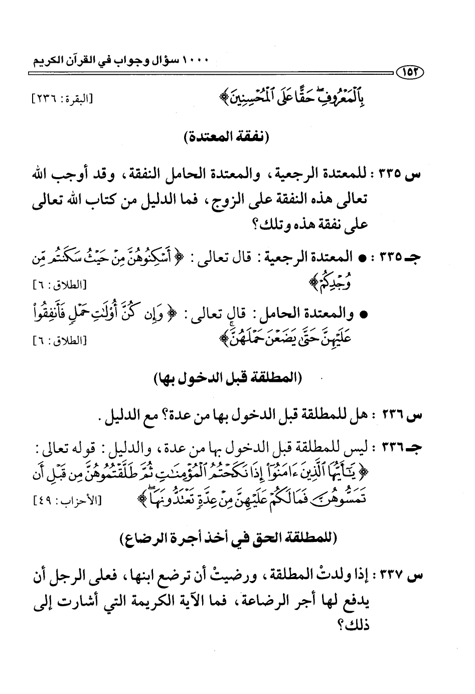 (س 335:) للمعتدة الرجعية، والمعتدة الحامل النفقة، وقد أوجب الله تعالى هذه النفقة على الزوج، فما الدليل من كتاب الله تعالى على نفقة هذه وتلك؟