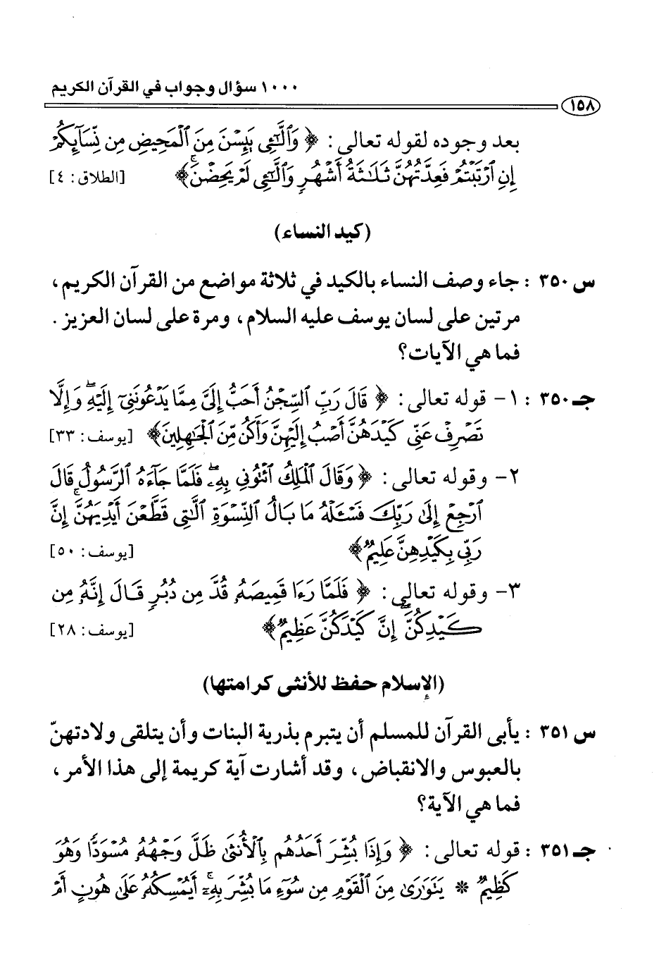 (س 350:) جاء وصف النساء بالكيد في ثلاثة مواضع من القرآن الكريم، مرتين على لسان يوسف عليه السلام، ومرة على لسان العزيز.