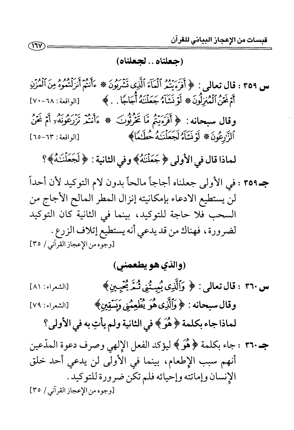 (ج 359:) في الأولى جعلناه أجاجا مالحا بدون لام التوكيد لأن أحدا لن يستطيع الادعاء بإمكانيته إنزال المطر المالح الأجاج من السحب فلا حاجة للتوكيد، بينما في الثانية كان التوكيد لضرورة، فهناك من قد يدعي أنه يستطيع إتلاف الزرع.