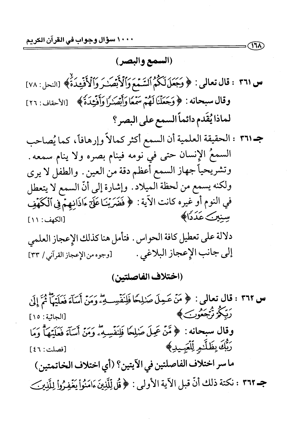(س 361:) قال تعالى: وَجَعَلَ لَكُمُ السَّمْعَ وَالْأَبْصارَ وَالْأَفْئِدَةَ [النحل: 78] وقال سبحانه: وَجَعَلْنا لَهُمْ سَمْعاً وَأَبْصاراً وَأَفْئِدَةً [الأحقاف: 26] لماذا يقدم دائما السمع على البصر؟