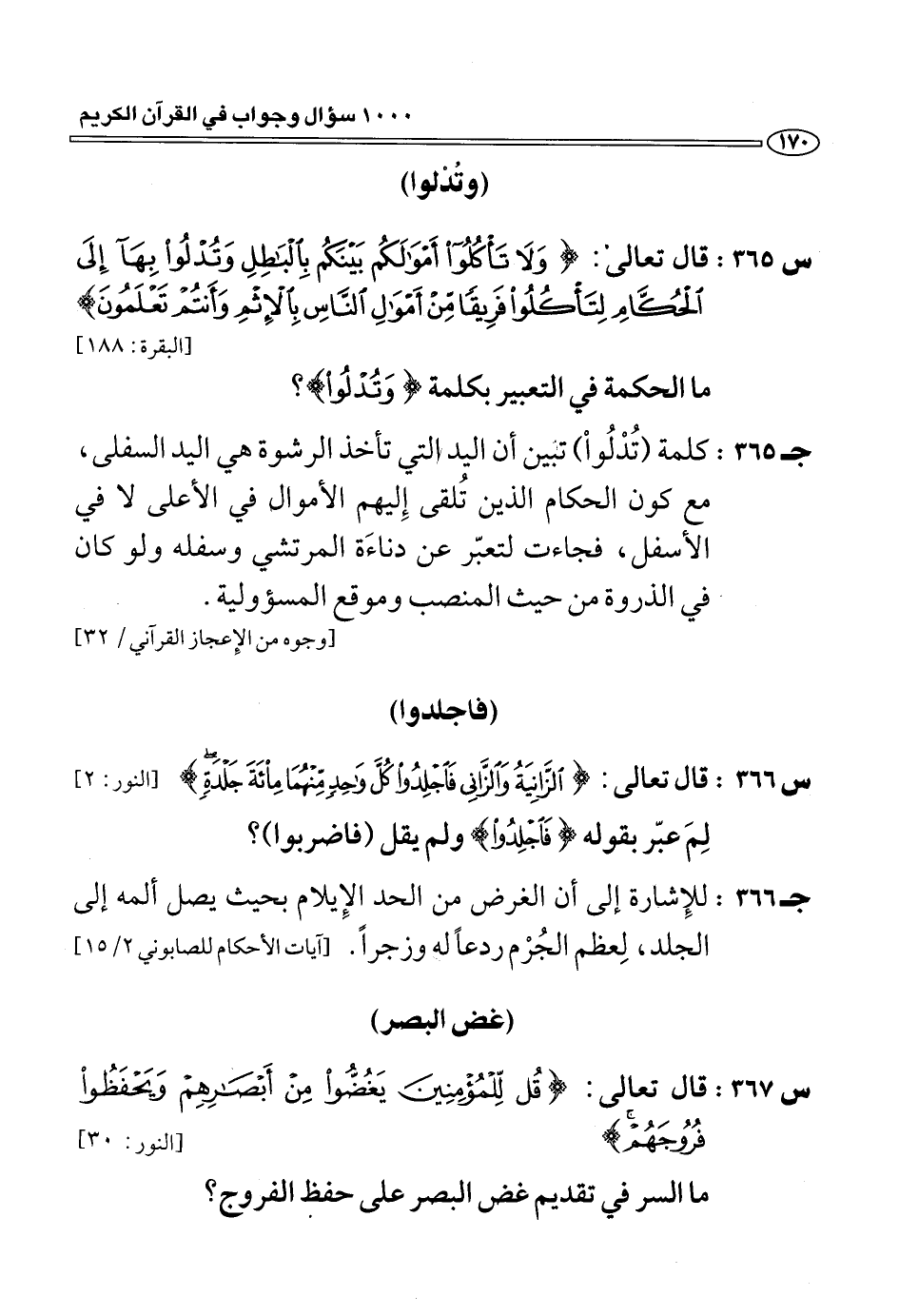 (س 365:) قال تعالى: وَلا تَأْكُلُوا أَمْوالَكُمْ بَيْنَكُمْ بِالْباطِلِ وَتُدْلُوا بِها إِلَى الْحُكَّامِ لِتَأْكُلُوا فَرِيقاً مِنْ أَمْوالِ النَّاسِ بِالْإِثْمِ وَأَنْتُمْ تَعْلَمُونَ [البقرة: 188] ما الحكمة في التعبير بكلمة وَتُدْلُوا؟