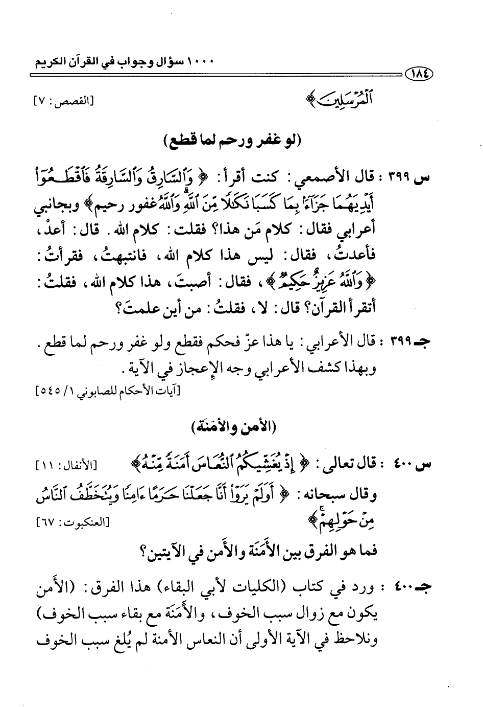 (س 399:) قال الأصمعي: كنت أقرأ: (وَالسَّارِقُ وَالسَّارِقَةُ فَاقْطَعُوا أَيْدِيَهُما جَزاءً بِما كَسَبا نَكالًا مِنَ اللَّهِ وَاللَّهُ غفور رحيم) وبجانبي أعرابي فقال: كلام من هذا؟ فقلت: كلام الله. قال: أعد، فأعدت، فقال: ليس هذا كلام الله، فانتبهت، فقرأت: