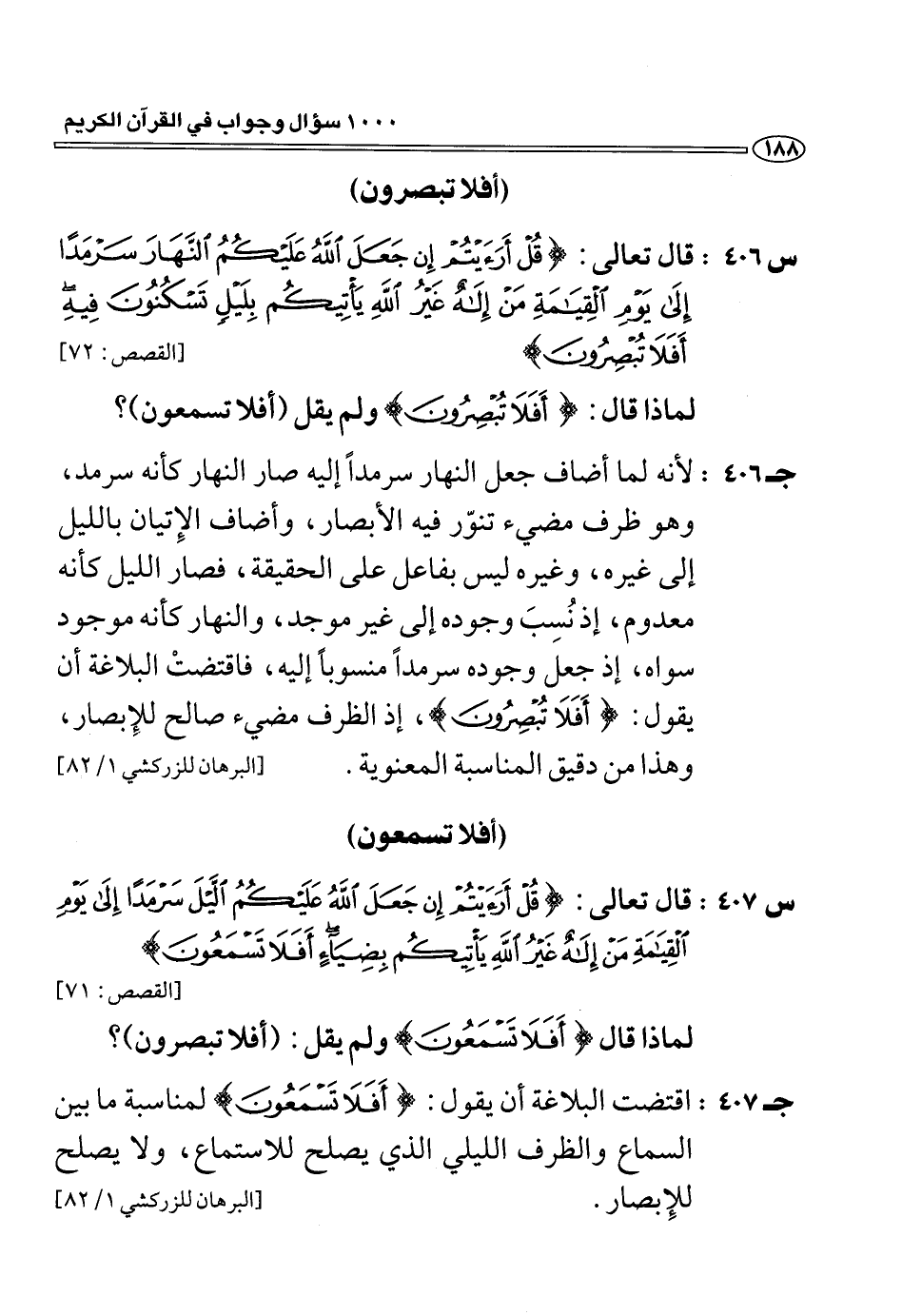 (س 406:) قال تعالى: قُلْ أَرَأَيْتُمْ إِنْ جَعَلَ اللَّهُ عَلَيْكُمُ النَّهارَ سَرْمَداً إِلى يَوْمِ الْقِيامَةِ مَنْ إِلهٌ غَيْرُ اللَّهِ يَأْتِيكُمْ بِلَيْلٍ تَسْكُنُونَ فِيهِ أَفَلا تُبْصِرُونَ [القصص: 72] لماذا قال: أَفَلا تُبْصِرُونَ ولم يقل (أفلا تسمعون)؟