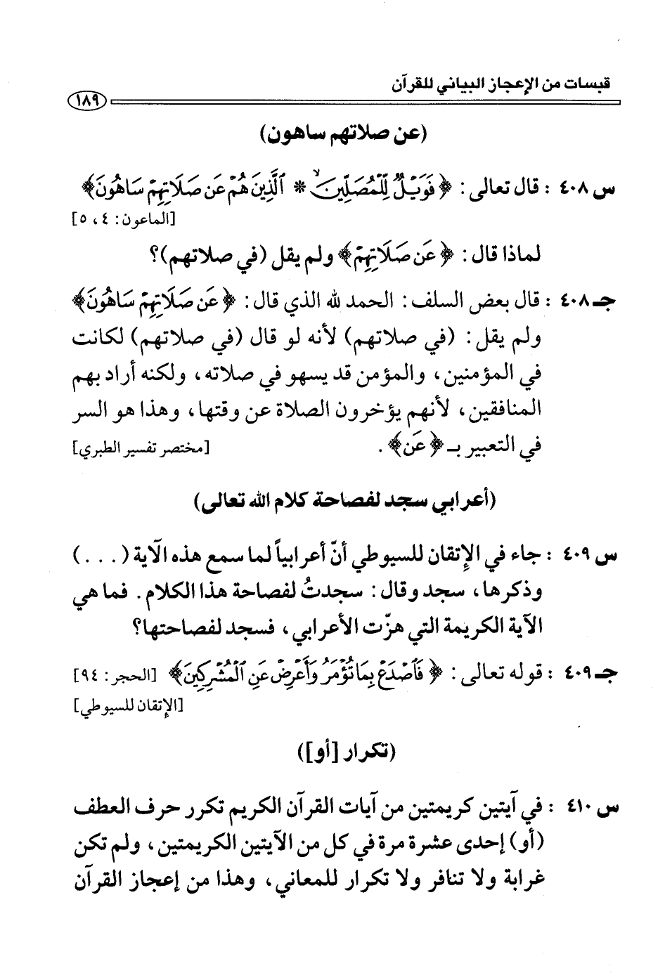 (س 410:) في آيتين كريمتين من آيات القرآن الكريم تكرر حرف العطف (أو) إحدى عشرة مرة في كل من الآيتين الكريمتين، ولم تكن غرابة ولا تنافر ولا تكرار للمعاني، وهذا من إعجاز القرآن