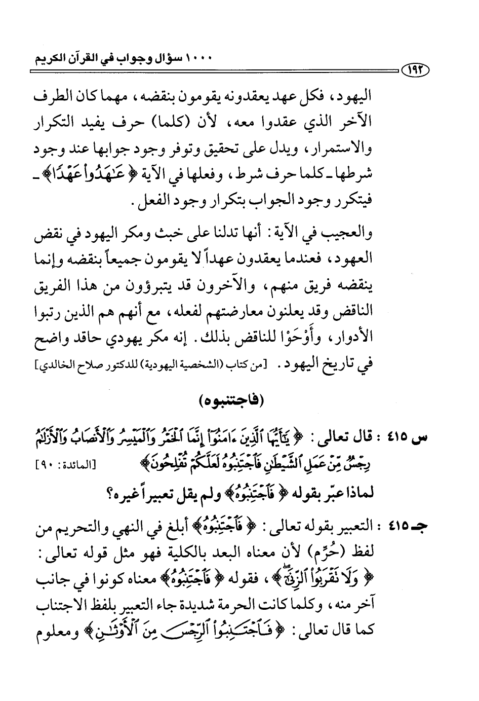(س 415:) قال تعالى: يا أَيُّهَا الَّذِينَ آمَنُوا إِنَّمَا الْخَمْرُ وَالْمَيْسِرُ وَالْأَنْصابُ وَالْأَزْلامُ رِجْسٌ مِنْ عَمَلِ الشَّيْطانِ فَاجْتَنِبُوهُ لَعَلَّكُمْ تُفْلِحُونَ [المائدة: 90] لماذا عبّر بقوله فَاجْتَنِبُوهُ ولم يقل تعبيرا غيره؟