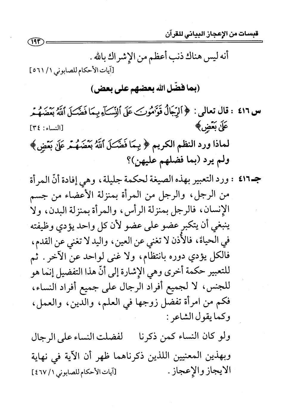 (س 416:) قال تعالى: الرِّجالُ قَوَّامُونَ عَلَى النِّساءِ بِما فَضَّلَ اللَّهُ بَعْضَهُمْ عَلى بَعْضٍ [النساء: 34] لماذا ورد النظم الكريم بِما فَضَّلَ اللَّهُ بَعْضَهُمْ عَلى بَعْضٍ ولم يرد (بما فضلهم عليهن)؟