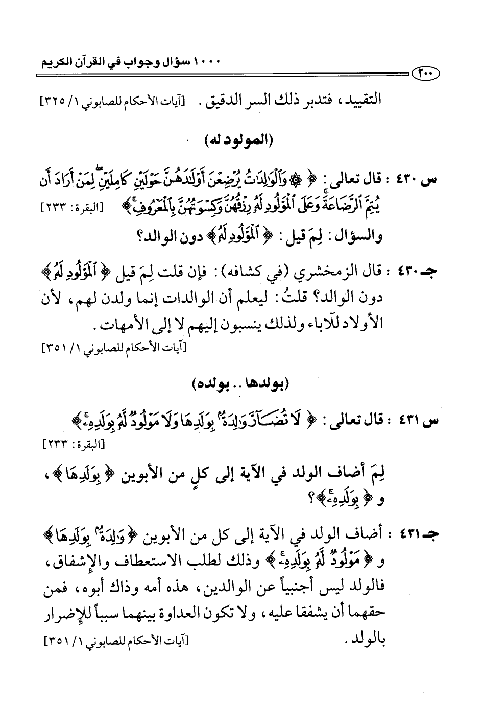 (س 430:) قال تعالى:* وَالْوالِداتُ يُرْضِعْنَ أَوْلادَهُنَّ حَوْلَيْنِ كامِلَيْنِ لِمَنْ أَرادَ أَنْ يُتِمَّ الرَّضاعَةَ وَعَلَى الْمَوْلُودِ لَهُ رِزْقُهُنَّ وَكِسْوَتُهُنَّ بِالْمَعْرُوفِ [البقرة: 233] والسؤال: لم قيل: الْمَوْلُودِ لَهُ دون الوالد؟