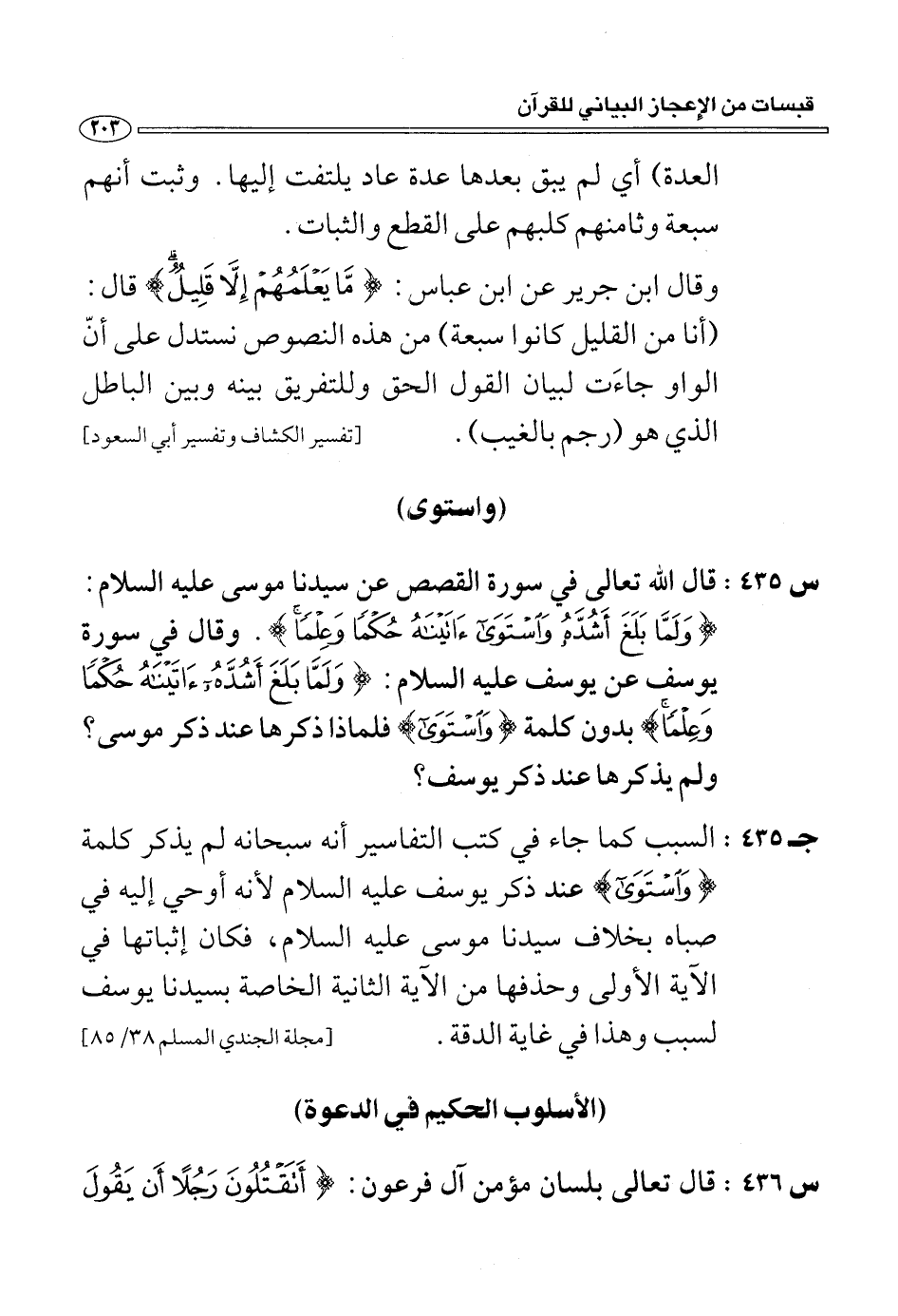 (ج 435:) السبب كما جاء في كتب التفاسير أنه سبحانه لم يذكر كلمة وَاسْتَوى عند ذكر يوسف عليه السلام لأنه أوحي إليه في صباه بخلاف سيدنا موسى عليه السلام، فكان إثباتها في الآية الأولى وحذفها من الآية الثانية الخاصة بسيدنا يوسف لسبب وهذا في غاية الدقة. [مجلة الجندي المسلم 38/ 85]