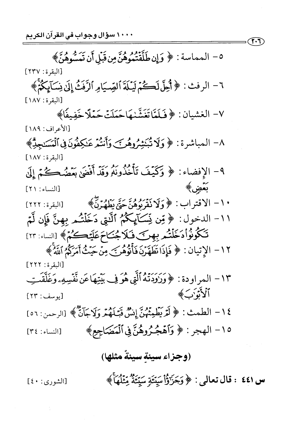 5 - المماسة: وَإِنْ طَلَّقْتُمُوهُنَّ مِنْ قَبْلِ أَنْ تَمَسُّوهُنَّ [البقرة: 237] 6 - الرفث: أُحِلَّ لَكُمْ لَيْلَةَ الصِّيامِ الرَّفَثُ إِلى نِسائِكُمْ [البقرة: 187] 7 - الغشيان: فَلَمَّا تَغَشَّاها حَمَلَتْ حَمْلًا خَفِيفاً [الأعراف: 189] 8 - المباشرة: وَلا تُبَاشِرُوهُنَّ وَأَنْتُمْ عاكِفُونَ فِي الْمَساجِدِ [البقرة: 187] 9 - الإفضاء: وَكَيْفَ تَأْخُذُونَهُ وَقَدْ أَفْضى بَعْضُكُمْ إِلى بَعْضٍ [النساء: 21] 10 - الاقتراب: وَلا تَقْرَبُوهُنَّ حَتَّى يَطْهُرْنَ [البقرة: 222] 11 - الدخول: مِنْ نِسائِكُمُ اللَّاتِي دَخَلْتُمْ بِهِنَّ فَإِنْ لَمْ تَكُونُوا دَخَلْتُمْ بِهِنَّ فَلا جُناحَ عَلَيْكُمْ [النساء: 23] 12 - الإتيان: فَإِذا تَطَهَّرْنَ فَأْتُوهُنَّ مِنْ حَيْثُ أَمَرَكُمُ اللَّهُ [البقرة: 222] 13 - المراودة: وَراوَدَتْهُ الَّتِي هُوَ فِي بَيْتِها عَنْ نَفْسِهِ وَغَلَّقَتِ الْأَبْوابَ [يوسف: 23] 14 - الطمث: لَمْ يَطْمِثْهُنَّ إِنْسٌ قَبْلَهُمْ وَلا جَانٌّ [الرحمن: 56] 15 - الهجر: وَاهْجُرُوهُنَّ فِي الْمَضاجِعِ [النساء: 34]
