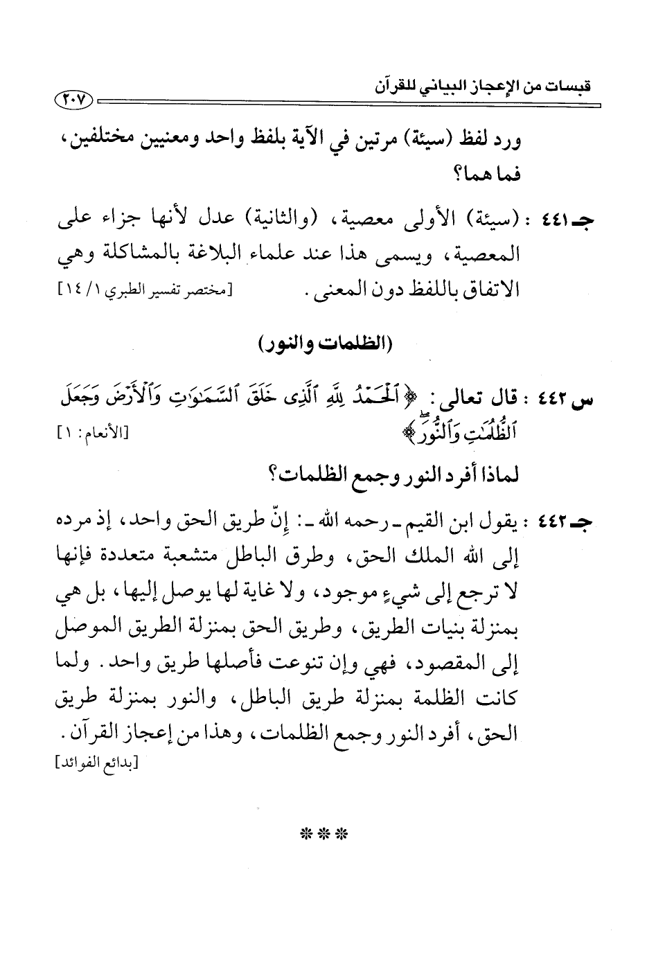 (ج 442:) يقول ابن القيم- رحمه الله-: إنّ طريق الحق واحد، إذ مرده إلى الله الملك الحق، وطرق الباطل متشعبة متعددة فإنها لا ترجع إلى شيء موجود، ولا غاية لها يوصل إليها، بل هي بمنزلة بنيات الطريق، وطريق الحق بمنزلة الطريق الموصل إلى المقصود، فهي وإن تنوعت فأصلها طريق واحد. ولما كانت الظلمة بمنزلة طريق الباطل، والنور بمنزلة طريق الحق، أفرد النور وجمع الظلمات، وهذا من إعجاز القرآن.