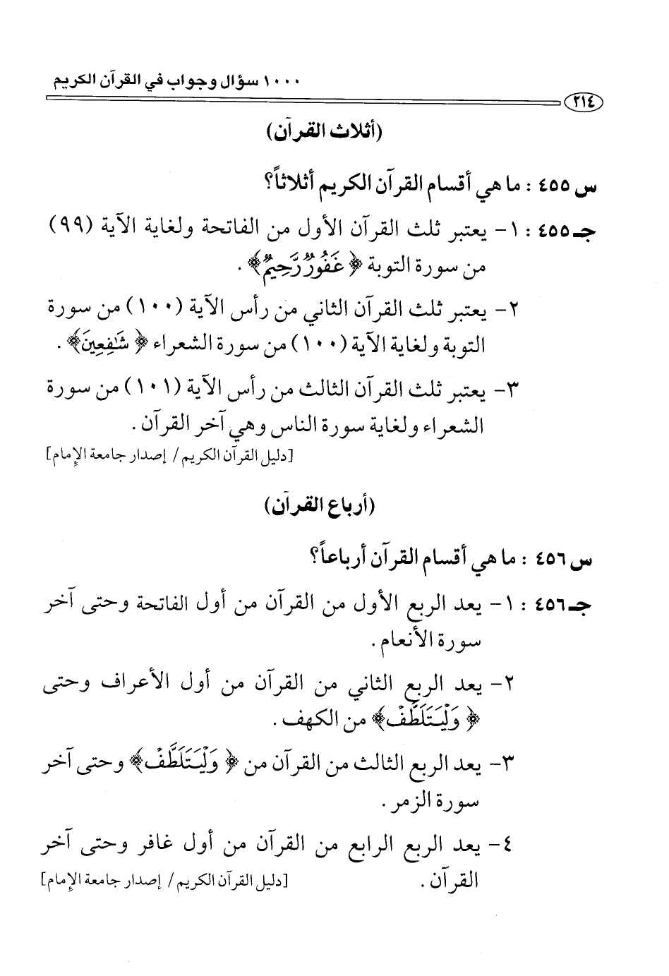 (س 455:) ما هي أقسام القرآن الكريم أثلاثا؟