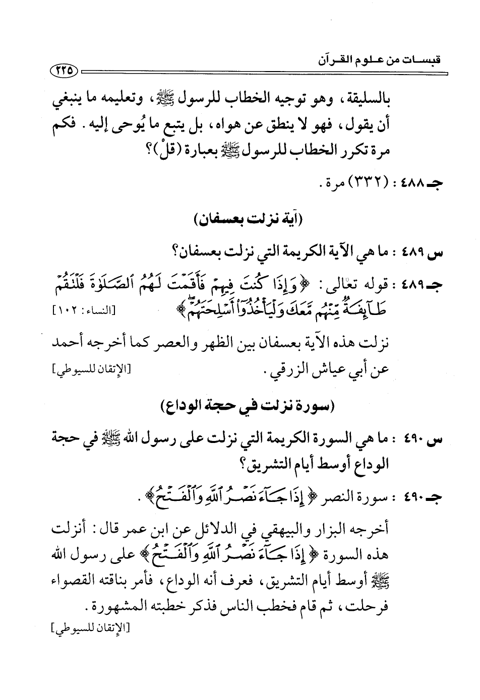 (ج 489:) قوله تعالى: وَإِذا كُنْتَ فِيهِمْ فَأَقَمْتَ لَهُمُ الصَّلاةَ فَلْتَقُمْ طائِفَةٌ مِنْهُمْ مَعَكَ وَلْيَأْخُذُوا أَسْلِحَتَهُمْ [النساء: 102] نزلت هذه الآية بعسفان بين الظهر والعصر كما أخرجه أحمد عن أبي عياش الزرقي. [الإتقان للسيوطي]